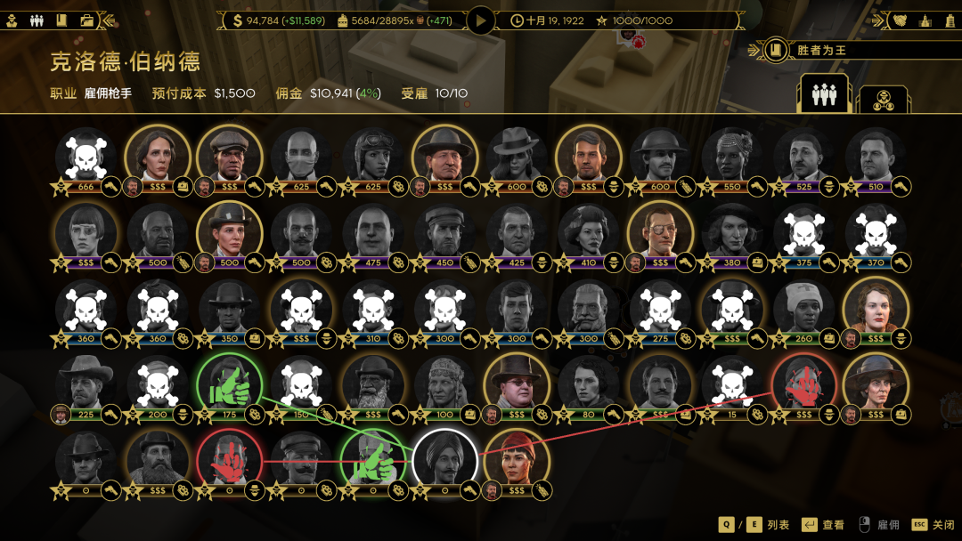 黑皮书上的人也是分为不同阶级的,越前面的人潜力越大,当然需要你的恶名值和佣金也越多。比较恶心的是每个人的工资是按你收入的百分比给的,所以最强的手下你根本养不起几个。每个人都有自己的性格特点和喜好厌恶的人,所以雇佣时候也要注意这一点。