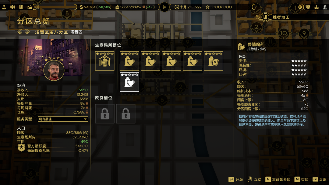 再来说下经营部分,打下一个据点后可以将它改造成酿酒厂、赌场、招待所、地下酒馆这些建筑。而酿酒是必须的,也是你金钱的主要来源,其他类型建筑各有不同特点,可以根据自己派系的加成进行侧重,建筑也有5个等级可以慢慢升级提高收入。但要吐槽的是这玩意没有自动管理,中后期根本顾不上升级,只要一直打下去收入也会提高。