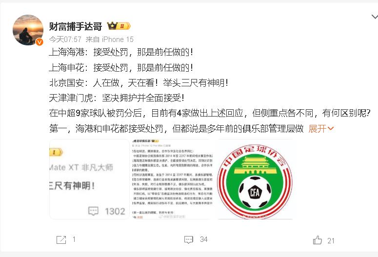 黄强歪谈体育认为,当相关部门处罚名单出炉,百分之九十以上的球队都诚恳接受,特别是以上海申花、上海海港、天津津门虎、浙江队等都在官方发出一篇诚恳道歉书,可是北京国安却发出,人在做,天在看!头顶三尺有神明!正是这简短几句话,大家认为他们在硬刚足协,对处罚极为不满意,认为足协和相关部门冤枉他们,他们可没有踢假球,更没有黑球,他们这样做,引起很多人关注,