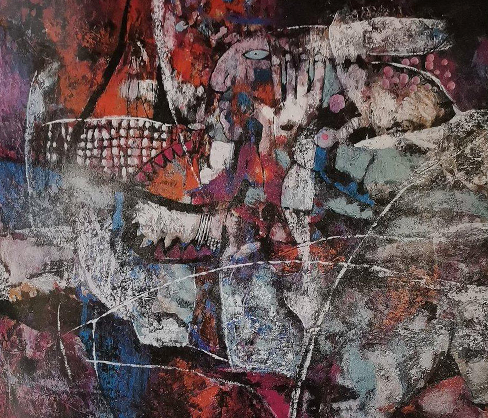 关玉良的重彩创作,首先体现在对色彩的“大胆突破”上。他不局限于传统重彩的矿物颜料体系,而是广泛吸纳西方现代绘画的色彩理念,将高饱和度的红、黄、蓝与低明度的紫、褐、黑并置,形成强烈的色彩对比;同时,他又深谙东方色彩的和谐之道,通过色彩的叠加、晕染,让看似冲突的色彩在画面中达成奇妙的平衡。这种色彩表达,既区别于传统重彩的典雅庄重,又不同于西方现代绘画的纯粹形式感,而是兼具“奇异”的视觉张力与“精妙”的美学韵律。在《生命之花》系列重彩作品中,他以大面积的红色象征生命的热烈,以深邃的蓝色代表现实的厚重,以明亮的黄色寓意梦想的希望,三色交织间,既展现出生命在现实与梦想中的挣扎与绽放,又传递出对未来的美好期许——色彩不再是单纯的视觉元素,而是成为了情感与思想的“具象化表达”。