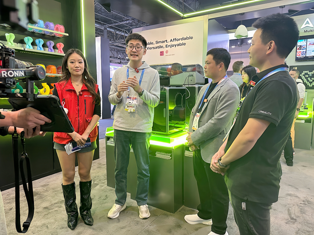在 CES(国际消费类电子产品展览会)的人潮中,头部科技博主、影视飓风创始人 Tim 正在创想三维(Creality)的展位上摆弄一台 3D 打印机。