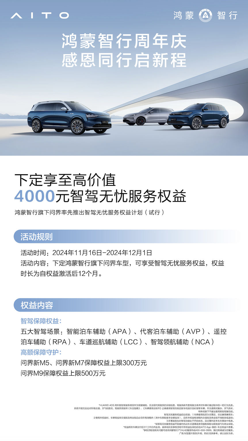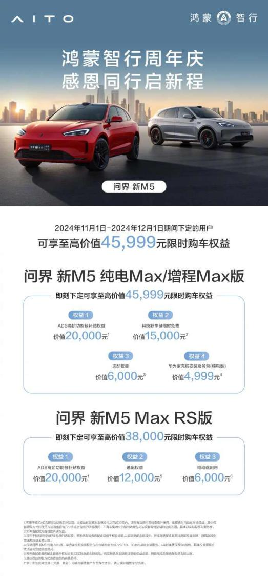 活动期间,即2024年11月1日至12月1日,下定问界新M5纯电Max、增程Max,享至高价值45999元鸿蒙智行周年庆购车权益,包括价值20000元的 ADS高阶包抵扣券、价值15000元科技舒享包优惠权益,价值6000元选配权益以及价值4999元华为家充桩安装服务包权益;下定问界新M5 Max RS享至高价值38000元鸿蒙智行周年庆购车权益,包括价值20000元的 ADS高阶包抵扣券、价值12000元的选配金以及价值6000元电动遮阳帘权益。