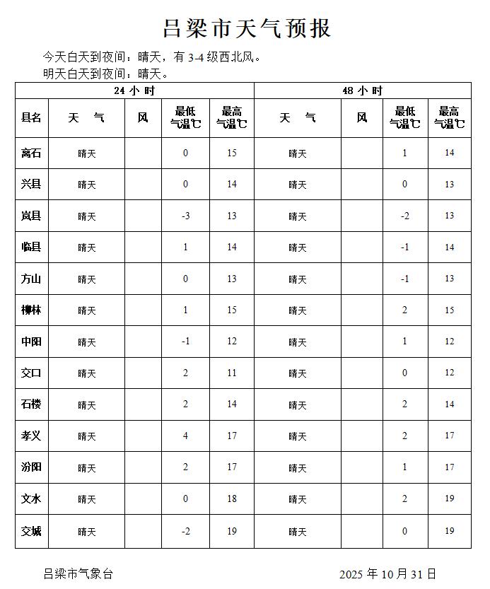 全市晴天,有3-4级西北风,最低气温-3~4℃,最高气温11~19℃。