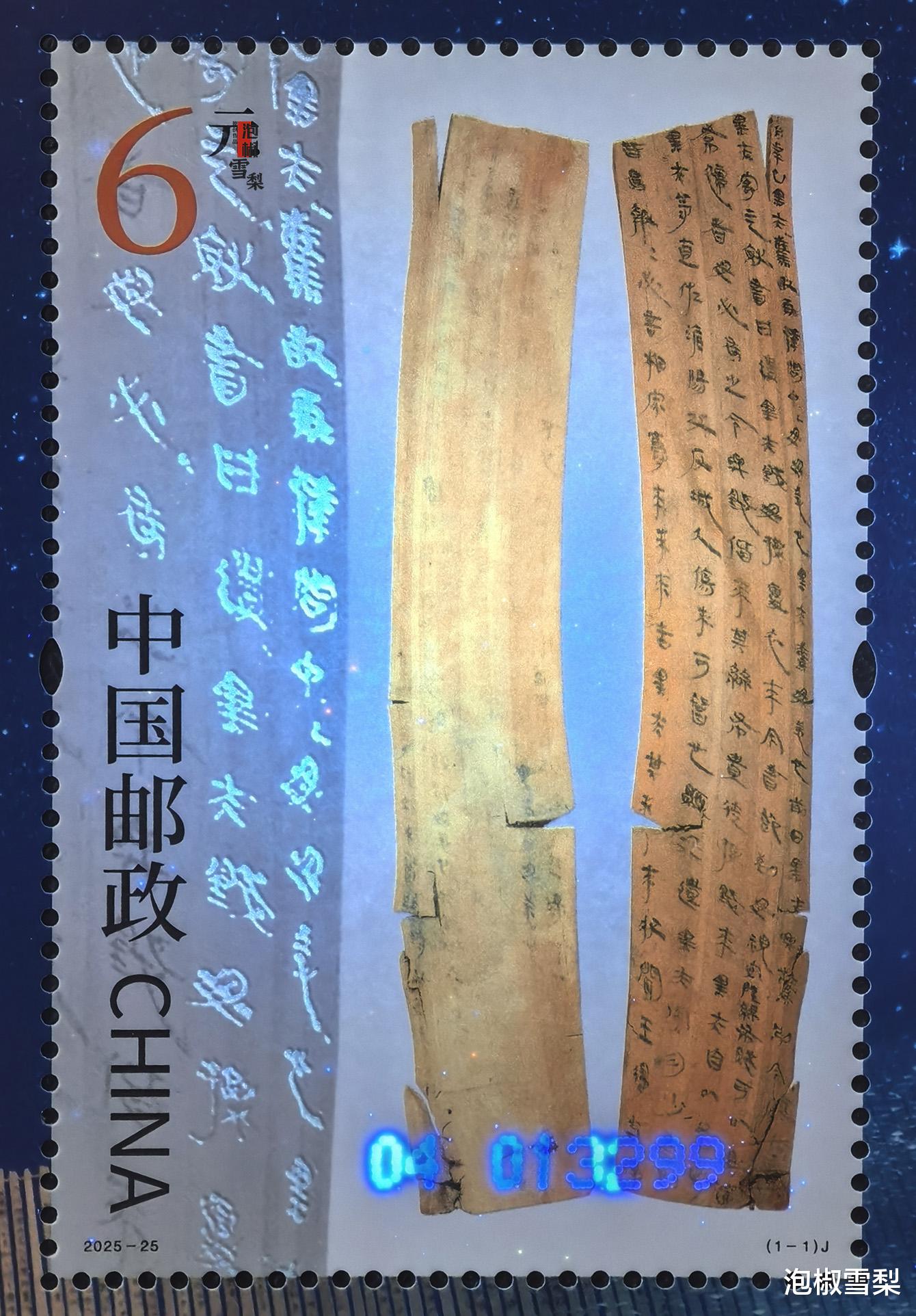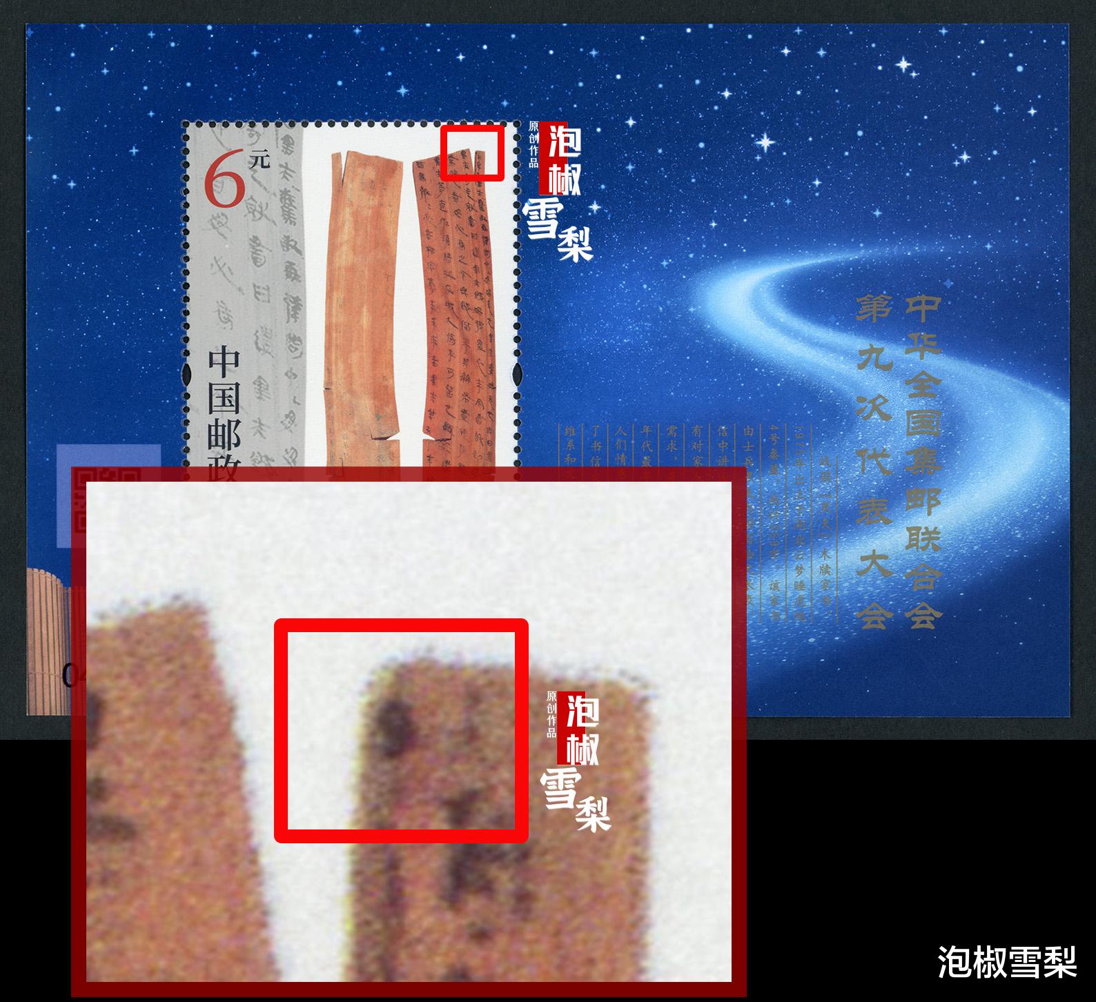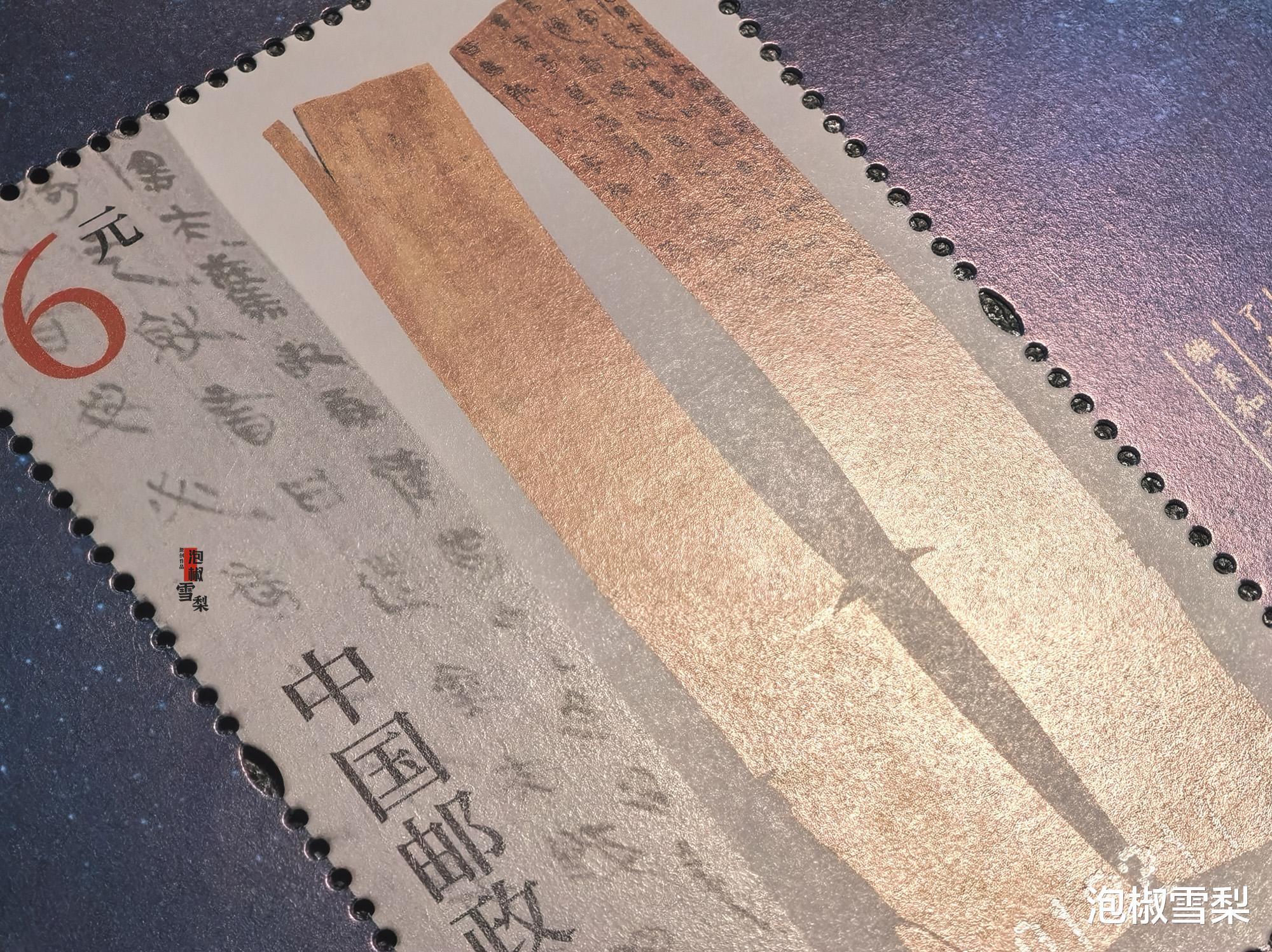 邮票表面平滑干净,胶版印刷图案也非常清晰,没有出现太过于明显的问题,只是边纸上的木简与背景电脑处理痕迹较重,星空十字星也有种重复的虚假感。