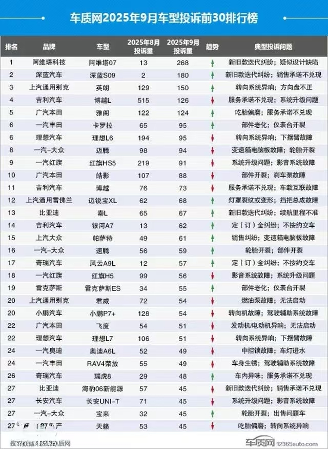 近日,车质网发布的2025年9月车型投诉前30榜单显示,广汽本田雅阁因124条关于“吃胎偏磨”及“服务承诺不兑现”的投诉,位列第五,投诉量较上月增加2条,呈现持续上升趋势。