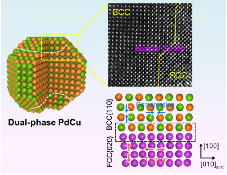 核心机制源于两种不同金属间晶格常数的差异,这种差异引起金属晶格结构的畸变,产生拉伸或收缩效应,进而导致金属的d能带中心发生偏移研究人员通过十六烷基三甲基溴化铵调控纳米晶表面能和相转变活化能,成功制备了双相PdCu纳米晶,有序体心立方相(BCC)和无序面心立方(FCC)同时存在于PdCu纳米晶中,(见图2),其带来的强相互电子作用赋予了双相PdCu优异的甲酸电氧化活性。