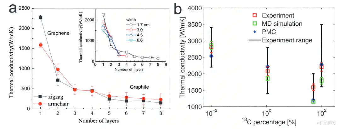 同位素组成的变化会改变晶体晶格的动力学性质,并影响其热导率研究人员发现随着C丰度的变化,石墨烯中的声子色散会因平均原子质量的变化而发生轻微改变。如图6 b所示,C掺杂比例为50%的石墨烯样品的热导率最低,此时两种同位素均匀混合,导致了最大的同位素散射。