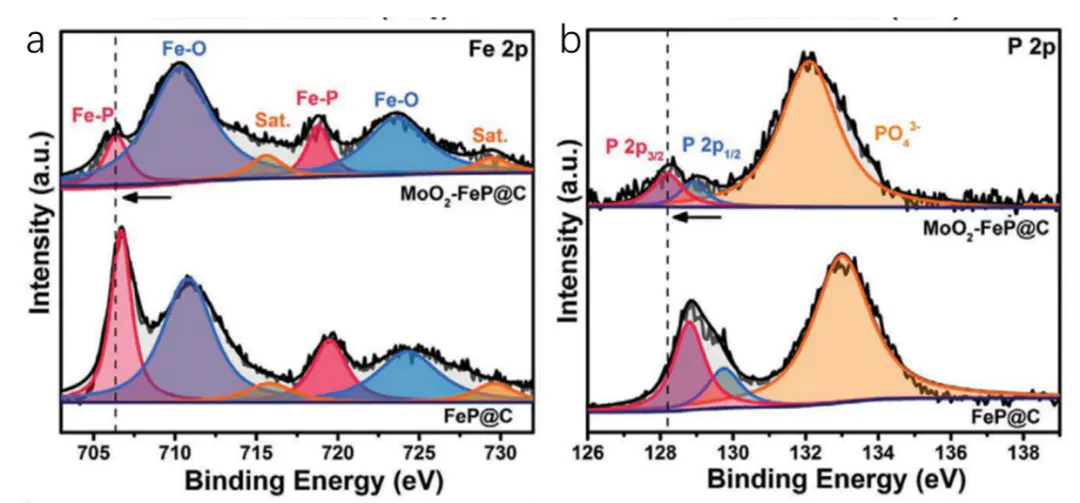 22异质结的形成导致MoO2向FeP转移2MoO的空穴积累促进了氧化反应的发生(见图3 a、b),以5-羟甲基糠醛(HMF)为生物质底物,转化率几乎为100%,得到2,5-呋喃二甲酸(FDCA)的选择性为98.6%。