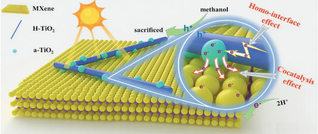 光吸收能力、光生电荷分离与迁移和界面催化反应研究人员采用静电自组装法制备了一种三元异质结光催化剂a-TiO/H-Ti0/TiC(MXTi)。,MXT具有较宽的光吸收范围和有效的载流子传输能力,其光催化析氢速率可达0.387mmol h,催化原理如图5所示。