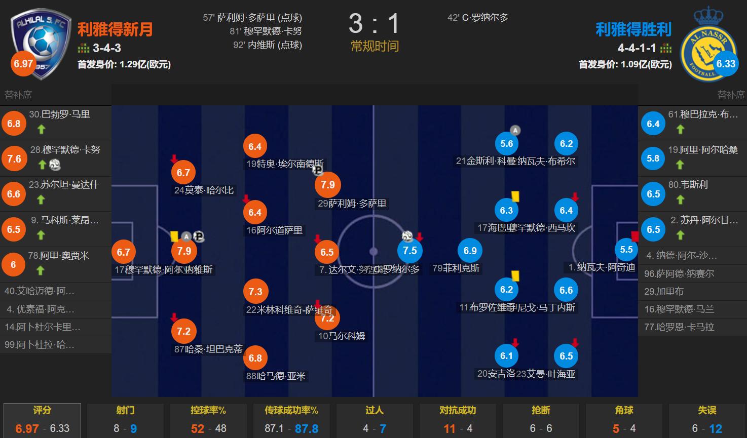 全场比赛,利雅得新月的控球率为52%,一共有8次射门,其中3次射正;利雅得胜利一共有9次射门,仅有1次射正。