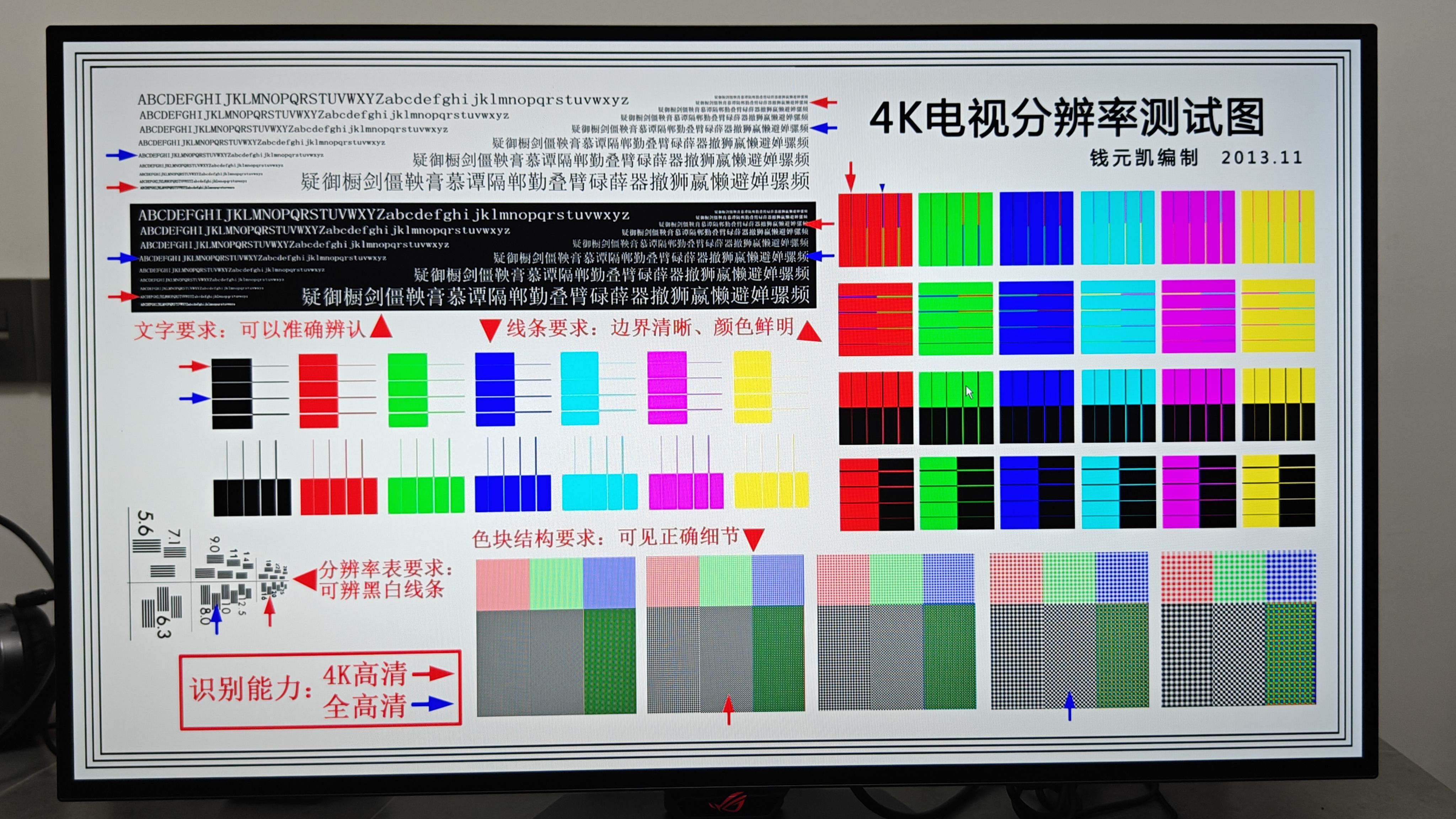 通过钱元凯教授的4K分辨率图来测试屏幕的分辨率,在4K@165Hz模式下了解这块屏幕的实际分辨率表现。