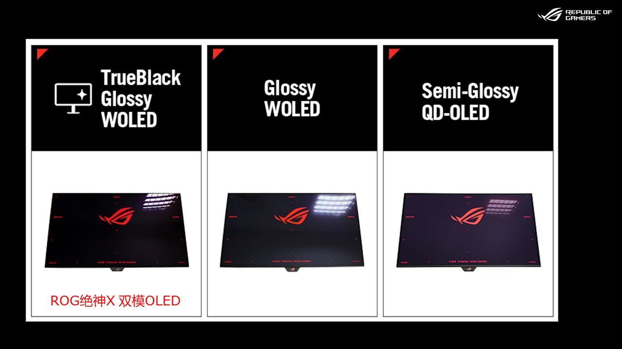 ROG绝神X 双模OLED显示器,采用第三代TrueBlack Glossy WOLED,这里简单科普下:TrueBlack 光面膜将Zero-Haze光学层与先进的抗反射叠层结合在一起, 可在任何光线下保持黑色色调不变,使显示器即使在明亮的环境中也能呈现深邃的黑色。与上一代 WOLED 面板相比,抗反射层使环境反射率降低了 38%,从而在有多种光源的环境里都能获得绝佳的视觉体验。