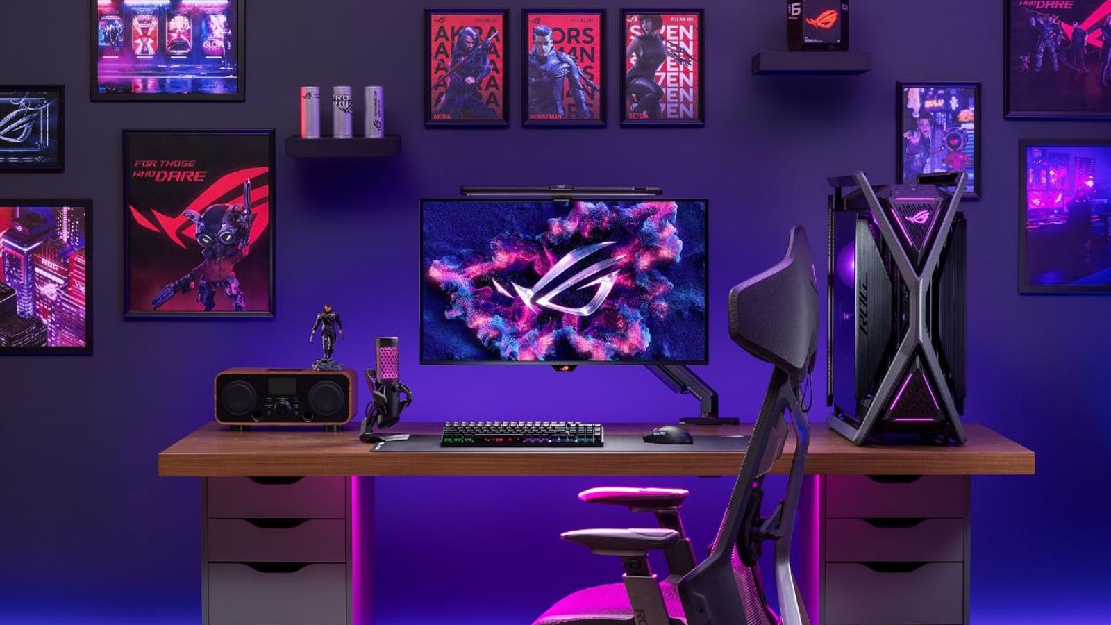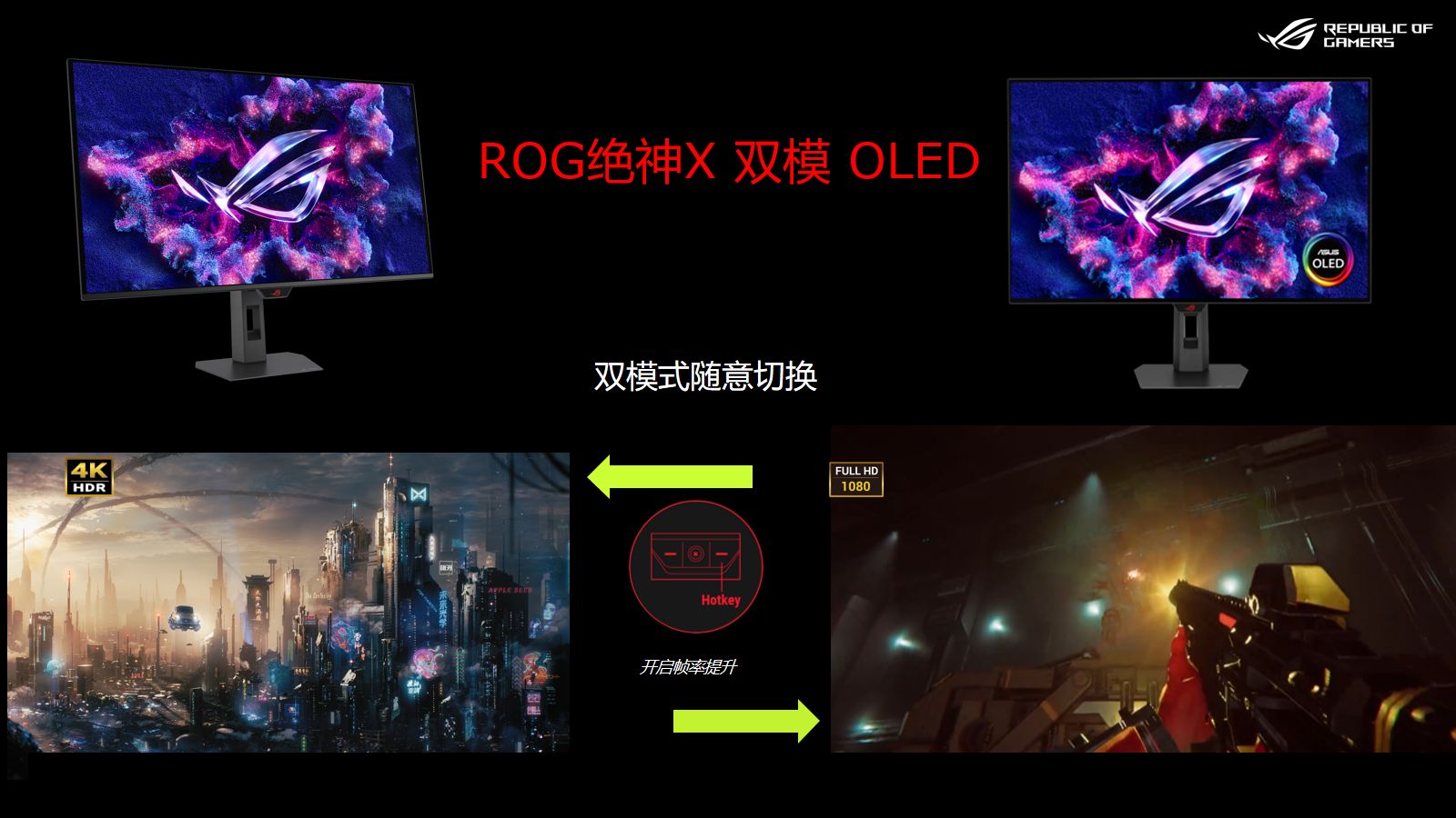 ROG绝神X 双模OLED显示器,支持4K@165Hz和1080P@330Hz两种显示模式,开启帧率提升,即可实现一键"双模切换" ,可实现3A大作和FPS竞技双端游戏自由。
