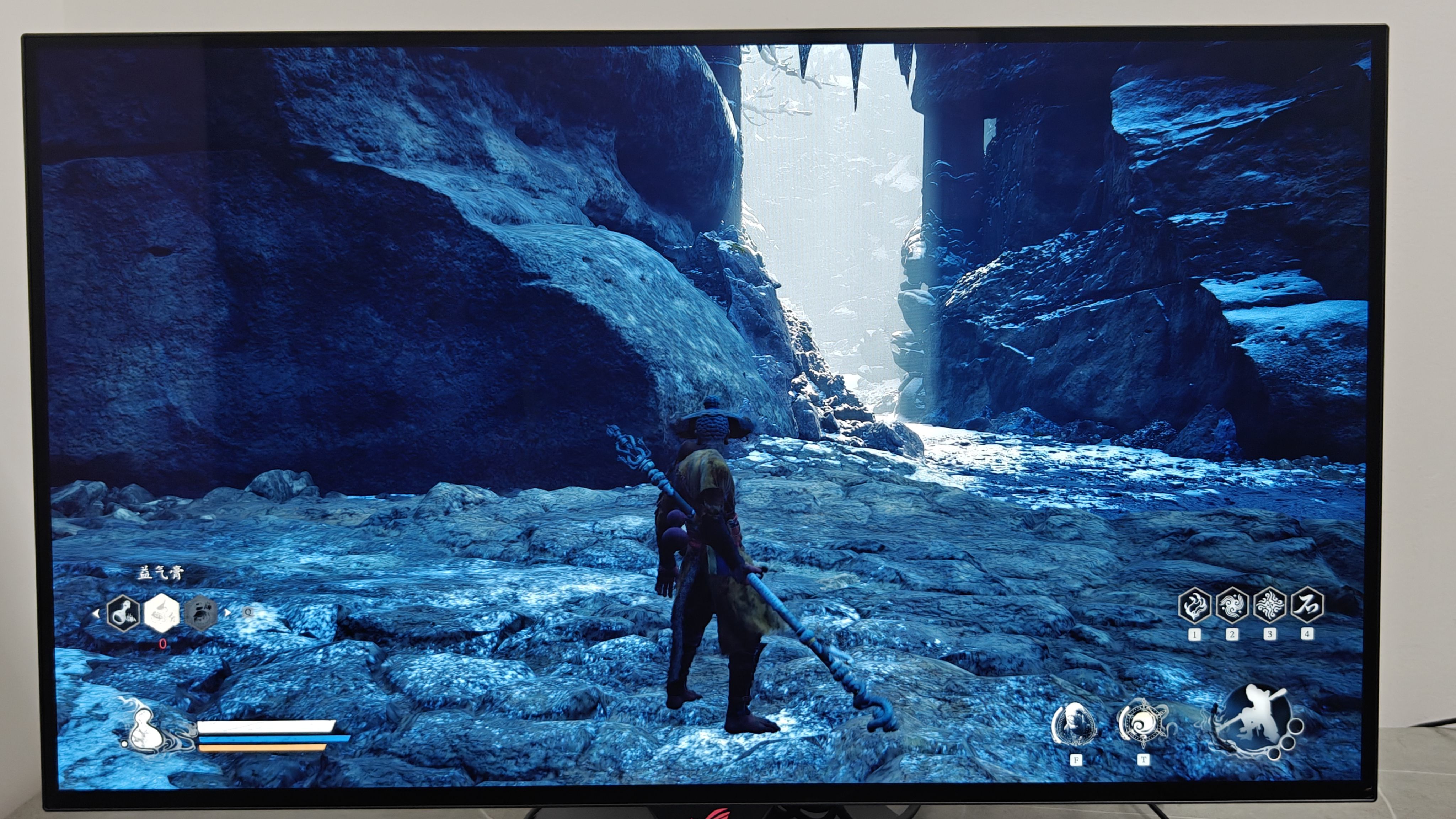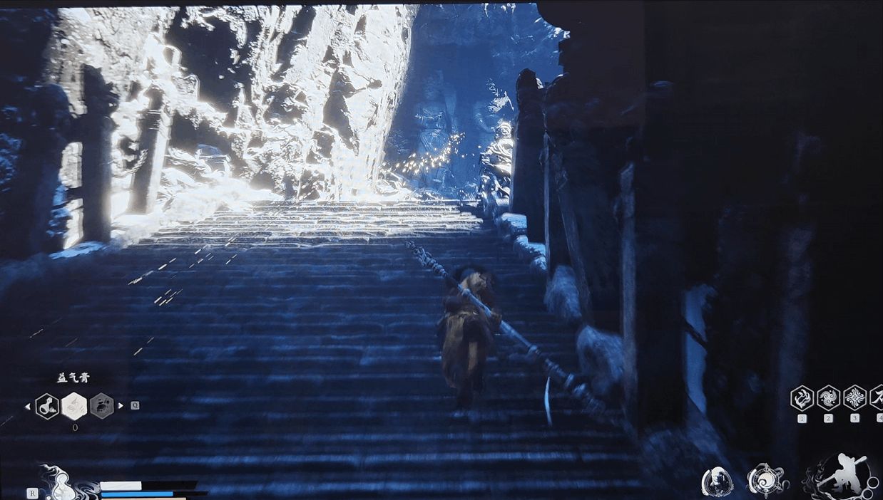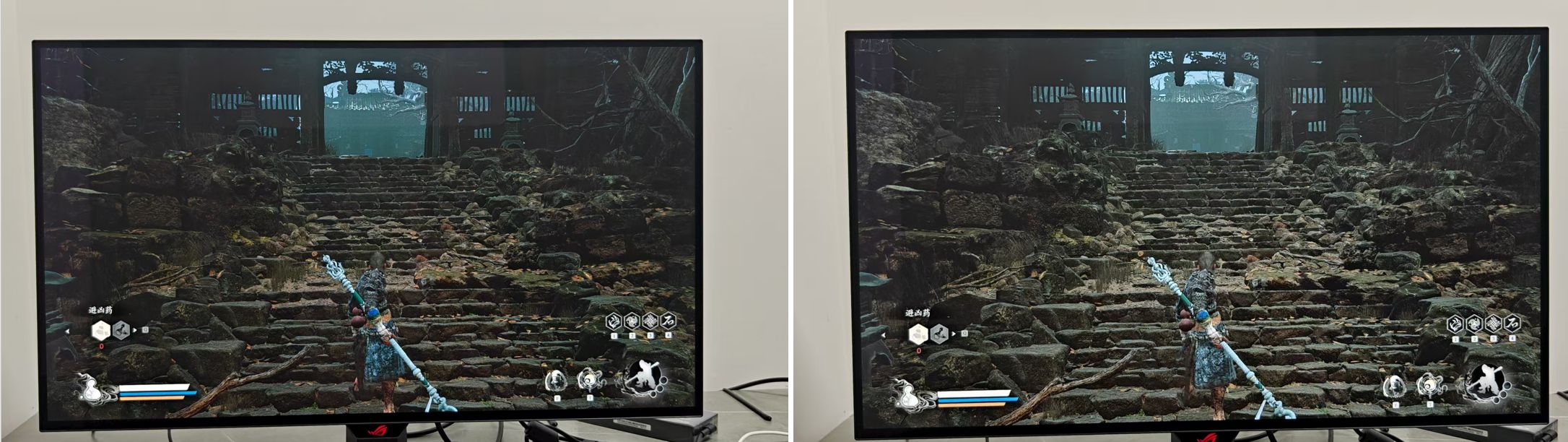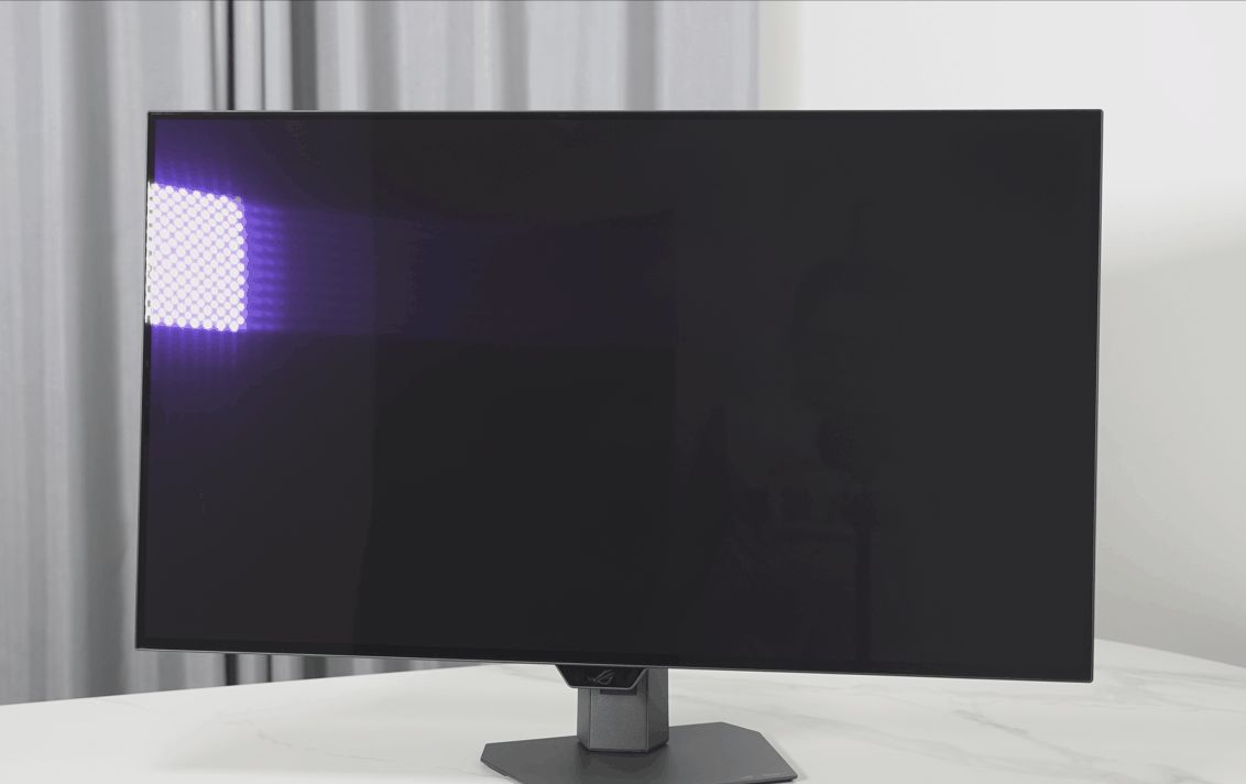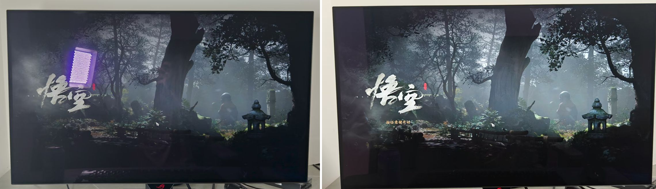 当然,别忘了Rog绝神X双模OLED显示器可是一块电竞显示器,色彩与调教方面不是强项,而是针对电竞的调教。说到这里,不得不提第三代OLED技术,这块屏幕的配备了抗反射涂层,在任何光线下,哪怕是强光的照射下,屏幕都能呈现出深邃的黑色。即使出现突然出现的光线,对画面的影响也很小,几乎不会干扰玩家的游戏体验。以黑神话悟空画面来看,即使是将补光灯打到功率最大,在屏幕上也仅仅会有很小的一部分被干扰,其它位置的画面几乎完全没有受到影响,让玩家能够沉浸式体验游戏。
