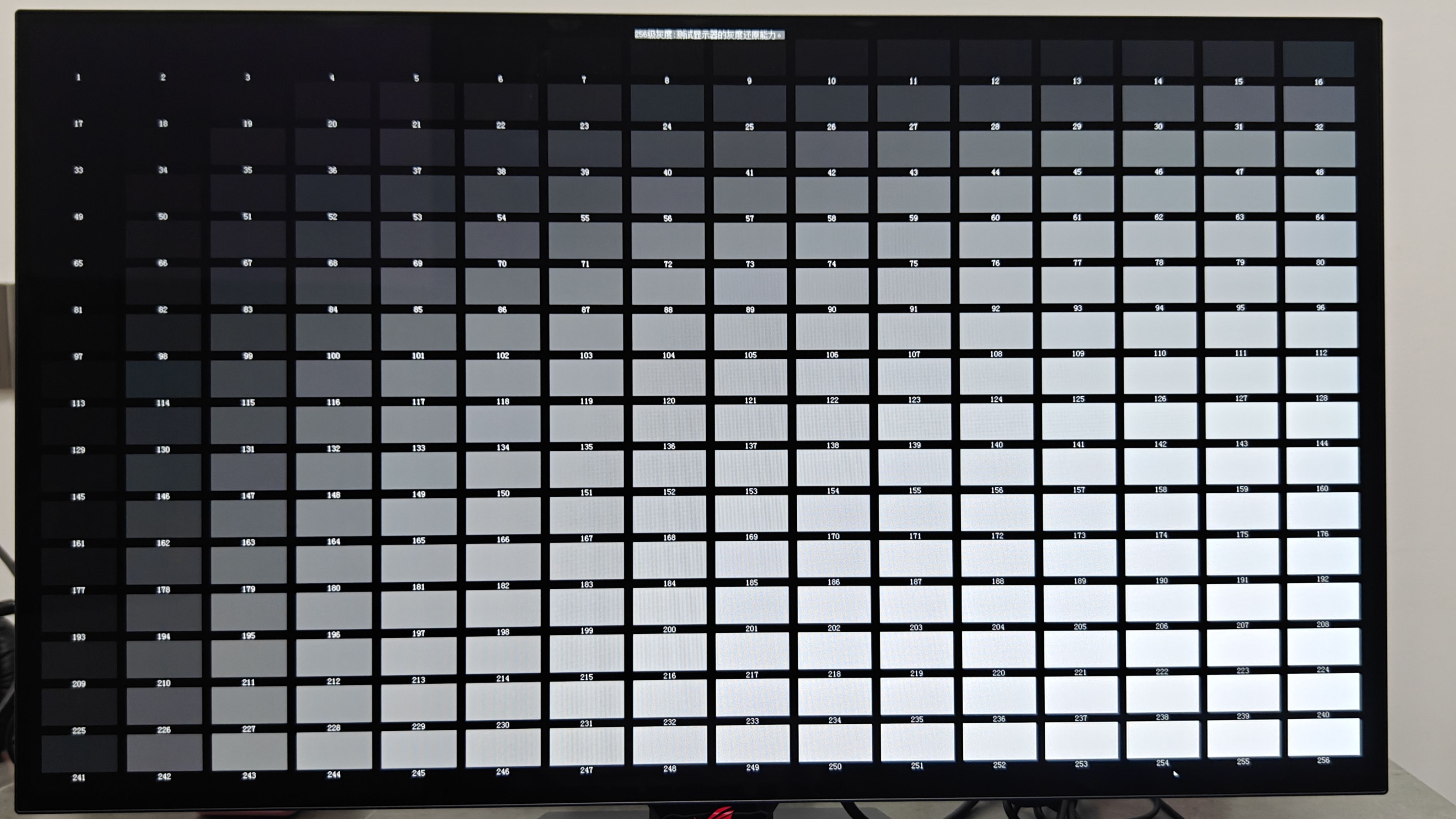 256级灰度测试图也可以清楚了解到,每个小方块都能清晰可见,这说明屏幕对灰度还原能力很不错。