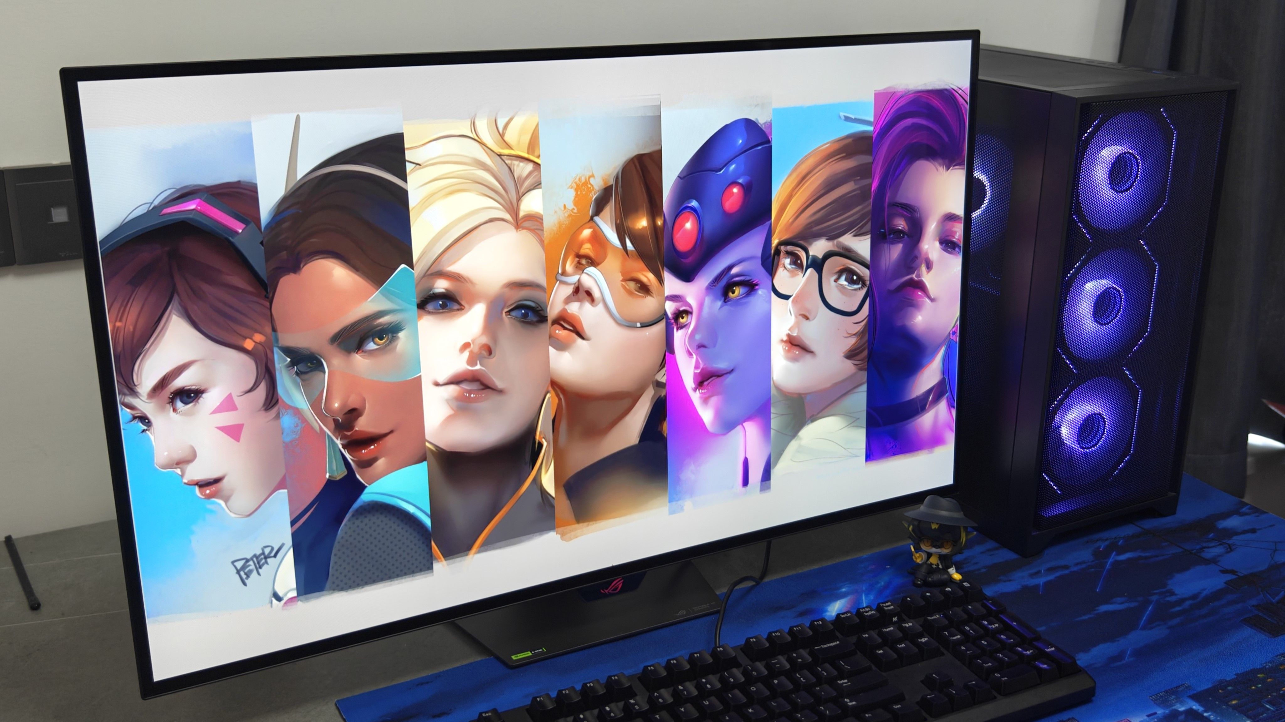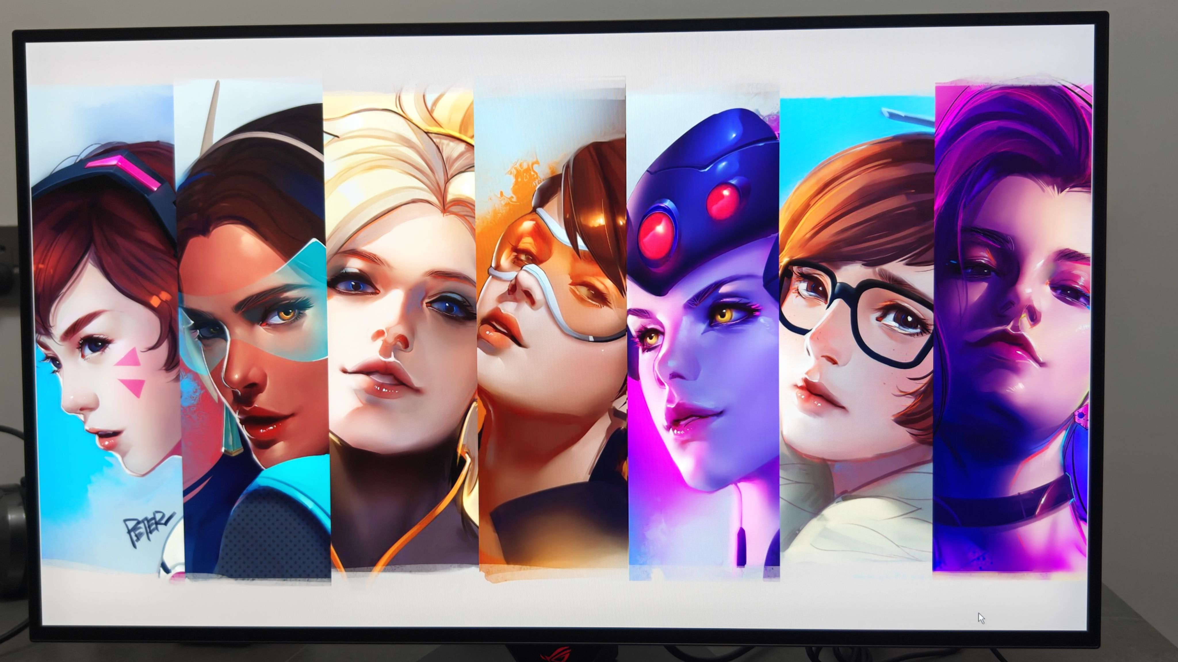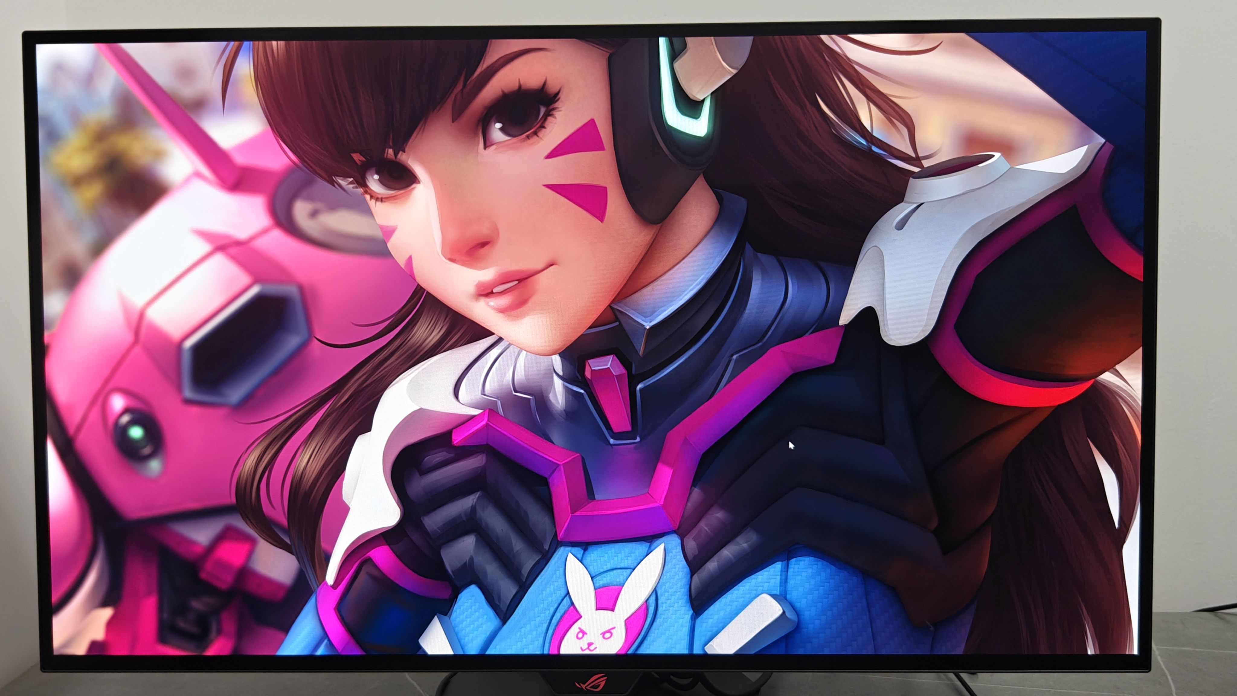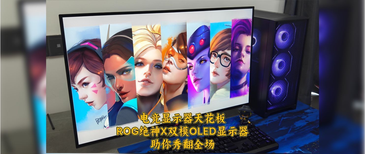 咱们通过壁纸、游戏体验来看看这块屏幕的色彩。首先来看看守望先锋的游戏壁纸,ROG绝神X双模OLED显示器能够充分展示出DVA机甲和着装上的层次感,包括脸上的细节也是非常细腻,色彩过渡表现自然。