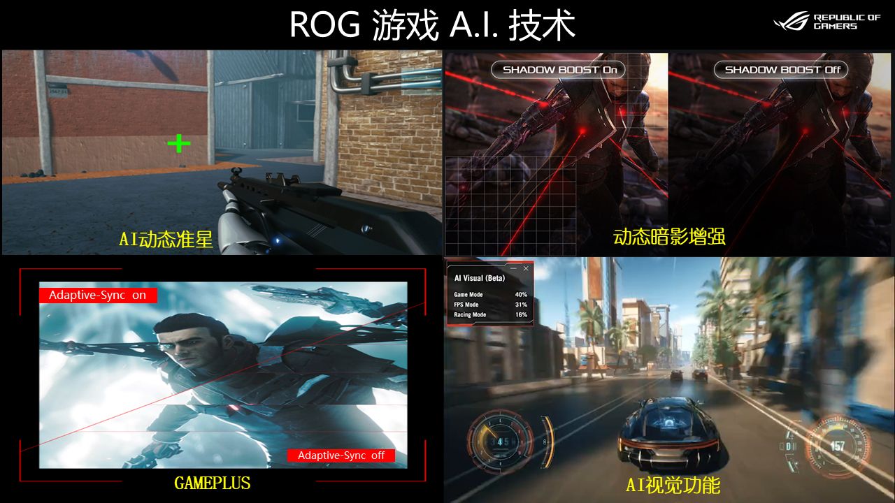 说到对游戏的加持,就不得不提ROG游戏 AI技术,它是内置一系列实用的游戏套件,助力提升游戏技能,有助于提升玩家游戏体验。