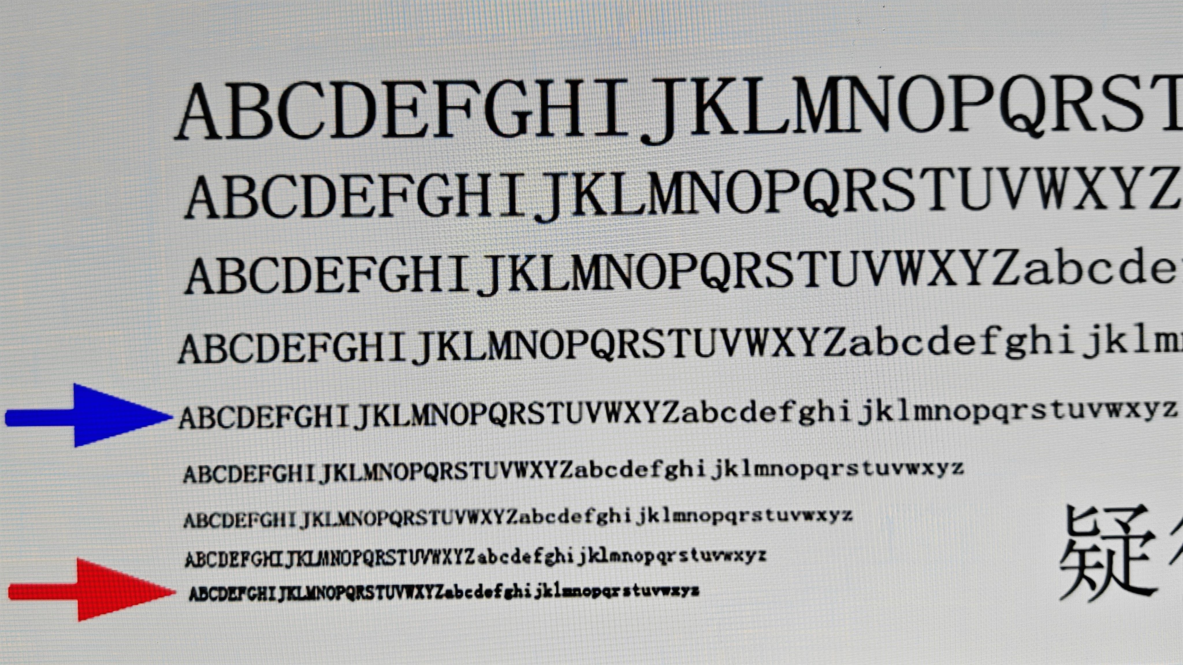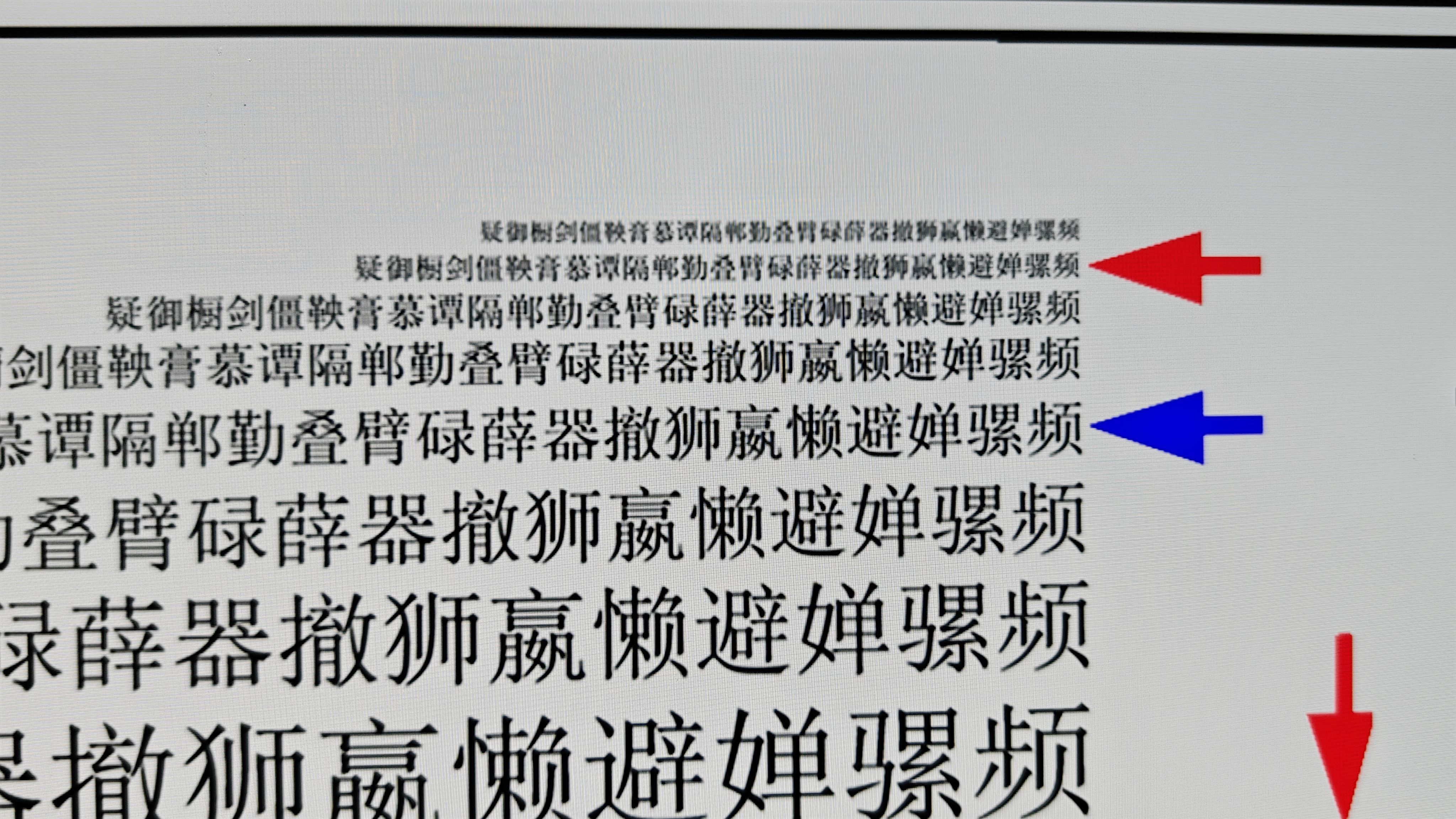 蓝色箭头指向为2K分辨率,红色箭头指向为4K分辨率,可以观察到,不论是英文字母还是汉字,红色箭头指向的字体一笔一划都清晰可见,汉字部分甚至字体进一步缩小都能看得清清楚楚。
