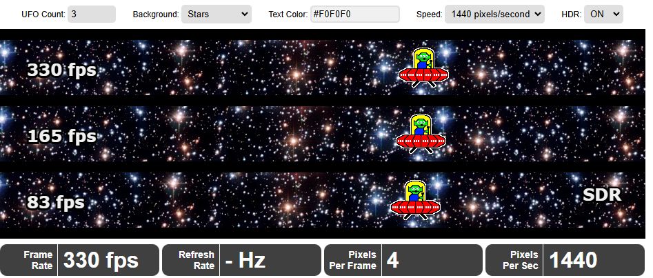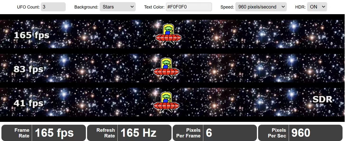 ROG绝神X 双模OLED显示器的响应时间仅为0.03ms,电竞想要快人一步,就必须追求高刷新率,咱们通过UFO Test来看看显示器的实际分辨率与刷新率,在4K@165Hz模式下,实测显示器的刷新率可以达到165Hz。