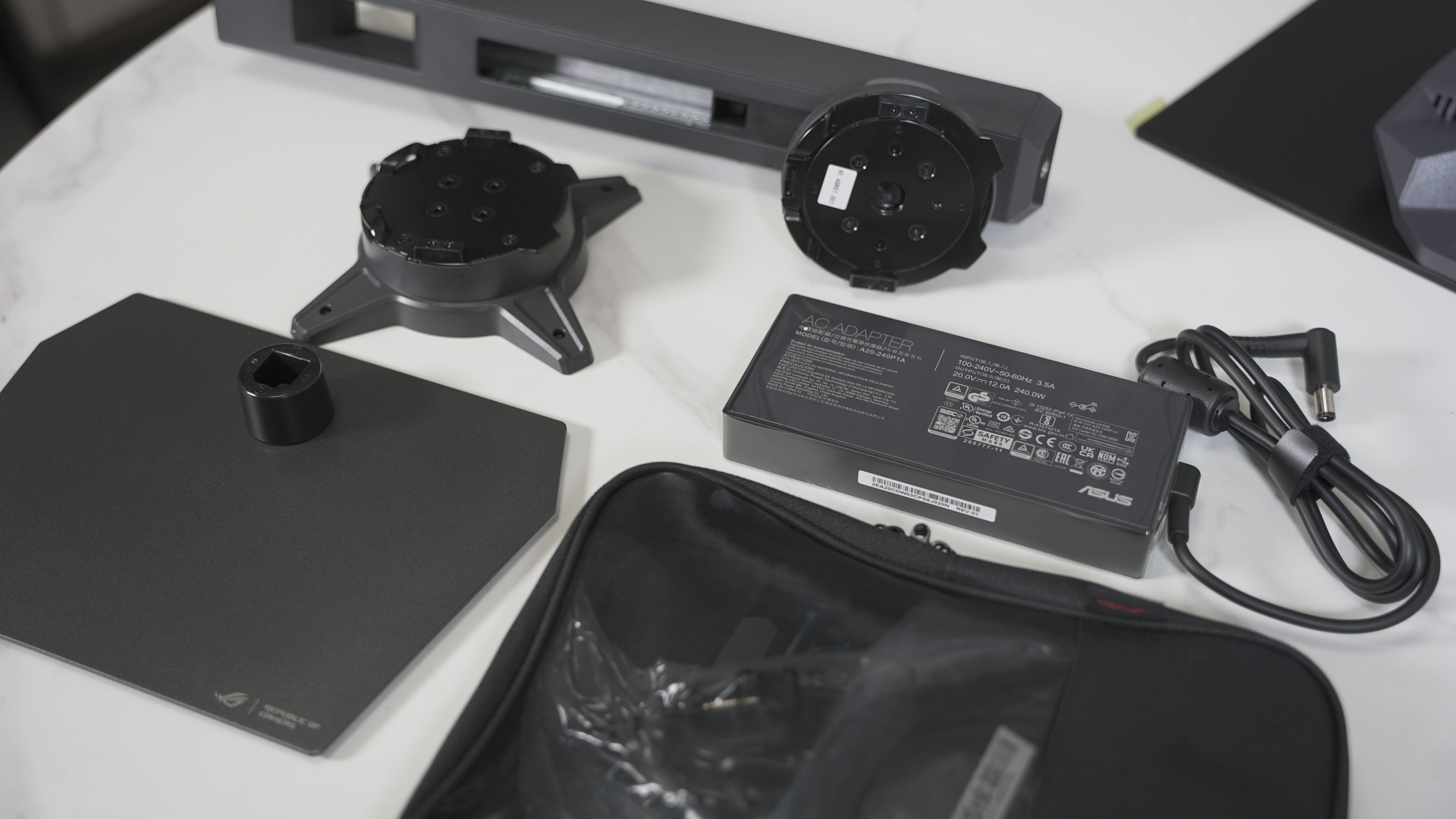 包装内除了显示器使用时必备的支架、电源线、收纳包以及ROG VESA 安装座等等,还赠送了ROG贴纸这类DIY的小玩意。