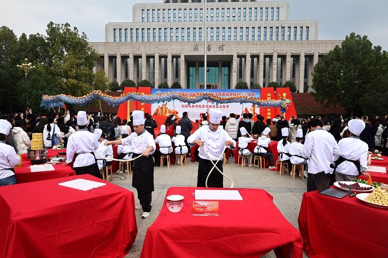 10月21日,信阳农林学院第九届食品文化节于汝宁广场开幕。信阳市人大常委会原副主任、信阳菜文化研究和产业发展促进会会长杨明忠,信阳市原畜牧局局长、信阳菜文化研究和产业发展促进会秘书长刘正国,信阳市食品安全协会秘书长吴章林,药食同膳精汤食品(信阳)有限公司董事长温继照,校党委副书记、工会主席王万玲,党委委员、副校长易军鹏、雷振山,学校相关职能部门负责同志、校企合作单位代表、师生代表参加了开幕式。开幕式由食品科学与工程学院院长李建芳主持。