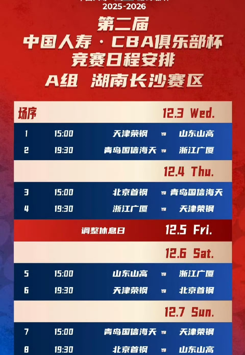 因为A组只有五支球队,所以12月5日是难得的休息日,山东男篮在这一天没有比赛。12月6日将对阵浙江广厦男篮,如果高诗岩能够报名参赛,那胡金秋和朱俊龙估计也差不多了。新赛季山东男篮虽然通过引援解决了三分球的问题,真正做到了攻防一体,但浙江广厦男篮毕竟是卫冕冠军,新外援塔克和桑普森能力很强,而且都是玩身体流的,这对于山东男篮内线冲击很大。而山东队现在缺少的就是内线的大个子,一旦陶汉林和克里斯陷入犯规麻烦,山东男篮想赢球就会变的非常困难,第四外援最好还是尽快引进,不一定非得等到赛季开始之后。