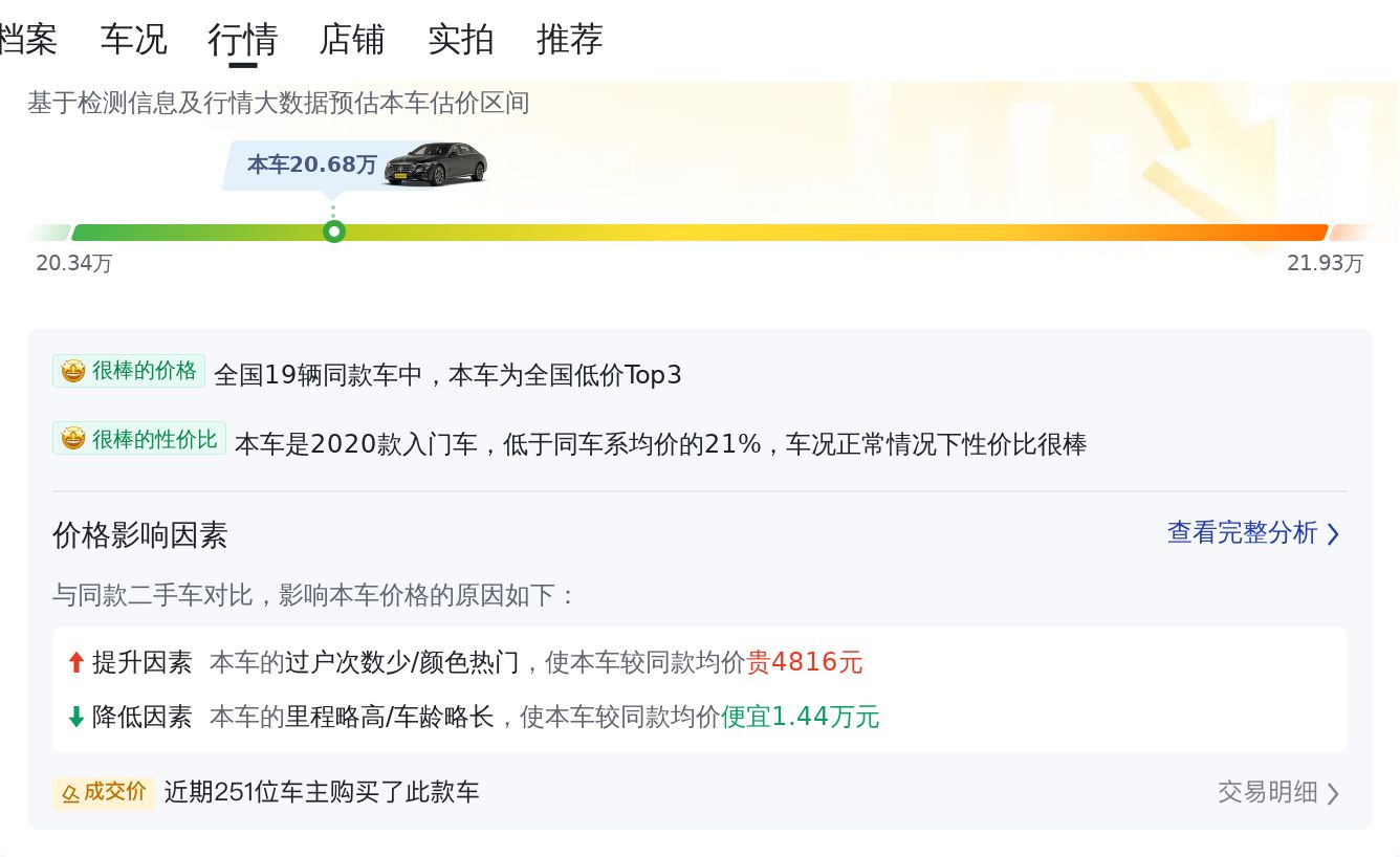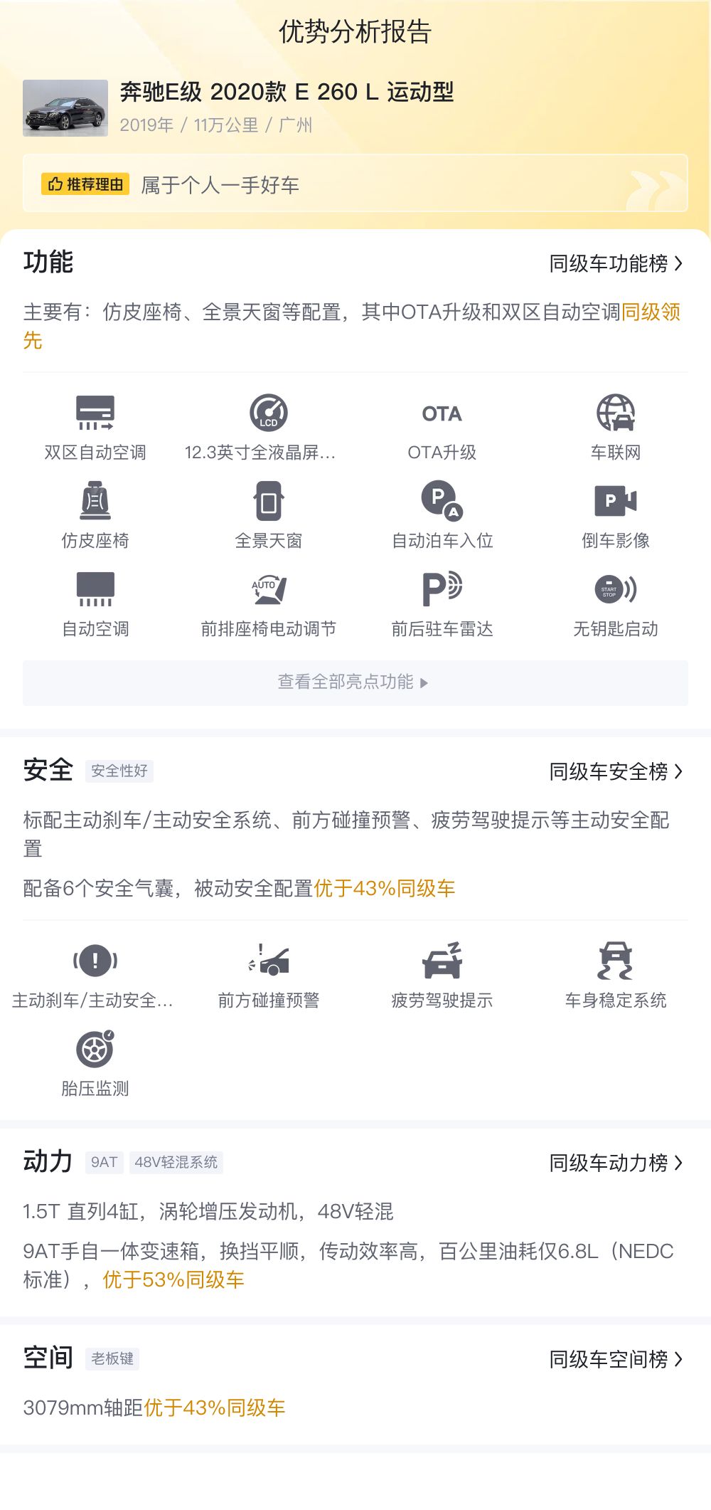 先介绍一下这辆车的基本信息,该车的具体版本是:奔驰E级 2020款 E 260 L 运动型,上牌地为佛山,上牌日期2019年12月,表显里程11万公里,新车指导价42.98万,二手车报价20.68万,过户次数0次,车源地广州,车身颜色黑色。