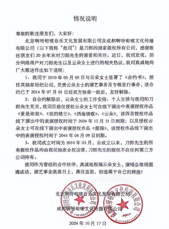 直到2023年10月,云朵才发声明表达对刀郎的尊敬,刀郎方面随后也澄清说两人早在2014年就结束了合约关系。