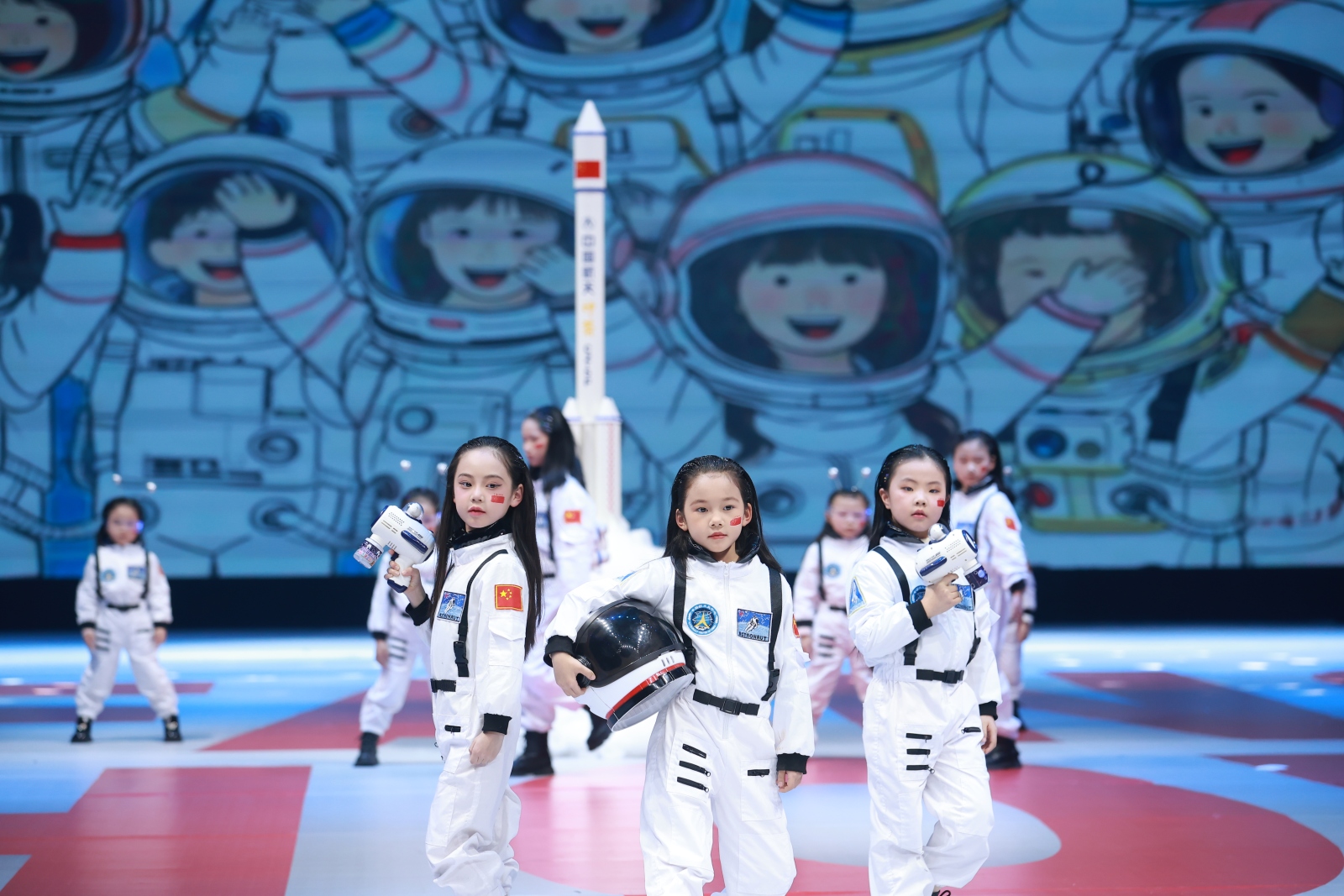 “航天筑梦勇承担,少年科技兴国强”是星河少年战队的核心信念,这一理念贯穿于造型设计与舞台演绎的每一处细节。小选手们身着定制潮服,以深邃航天蓝与金属银为主色调,面料上点缀荧光科技图案与3D打印镂空材质,部分造型搭配仿真宇航头盔与LED灯带装饰,行走间宛如星河流动,将“科技感+未来感”诠释得淋漓尽致。队列编排上,战队巧妙融入火箭发射、空间站对接等航天场景灵感,台步稳健有力,队形变换精准同步,时而如卫星环绕,时而如火箭升空,将探索宇宙的浪漫与豪情具象化,让观众仿佛置身于浩瀚星际。
