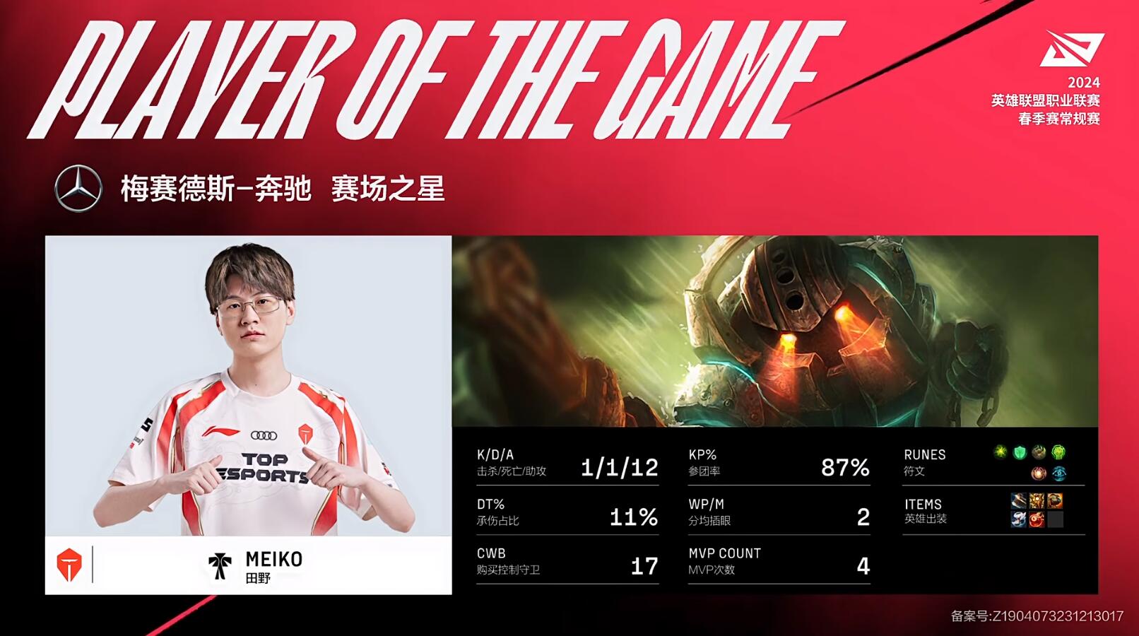 MVP没有悬念的给到了Meiko,牛头的发挥有点夸张,理论上TES这个阵容是真不太好找机会的。
