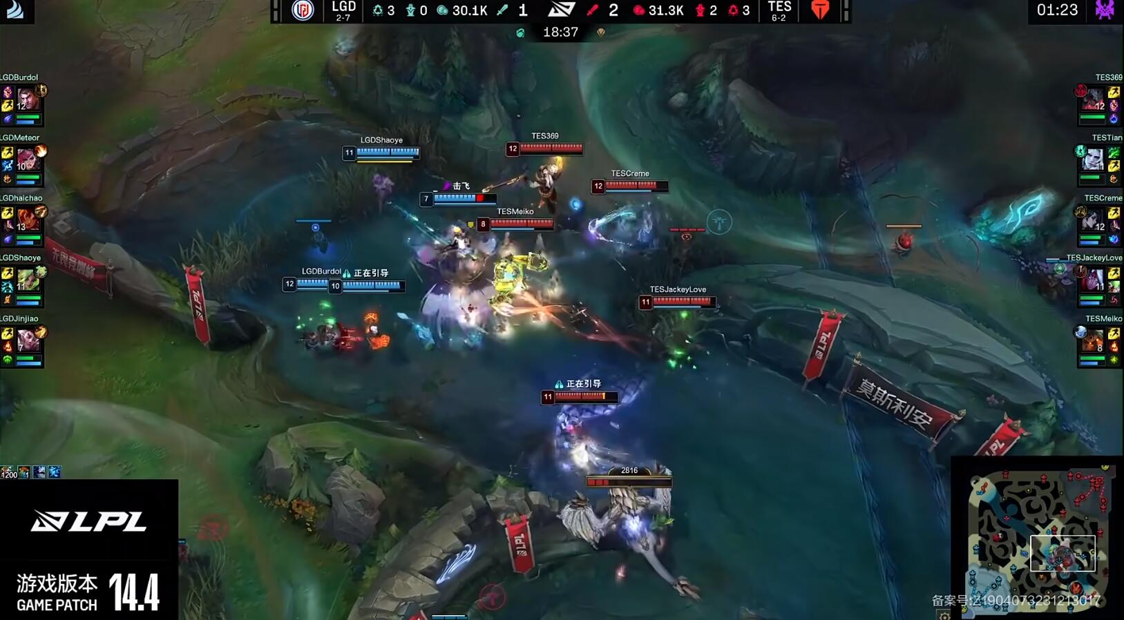 中期TES原本先手能力比较差的阵容因为Meiko的活跃表现连连打出小节奏,这也帮助TES在经济上咬住了LGD。