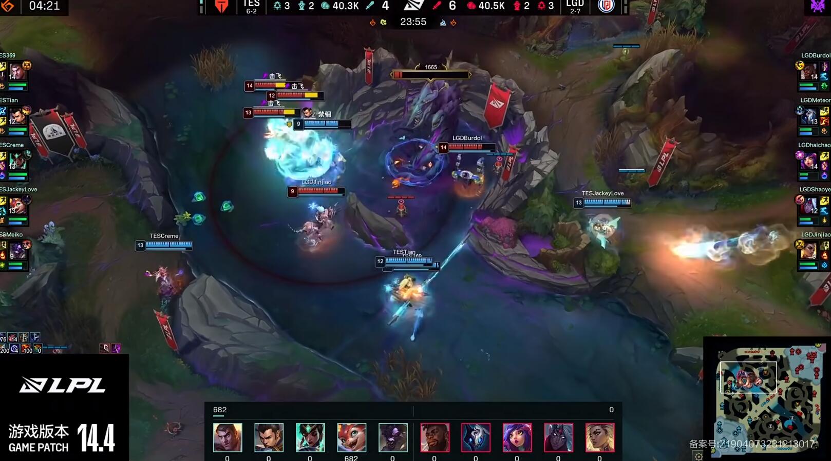 前期TES对线表现出色,Tian前期资源全收并且在上路蹲草配合剑魔拿下杰斯一血,中期LGD中野开始辐射边线,但并没能取得多少战果。