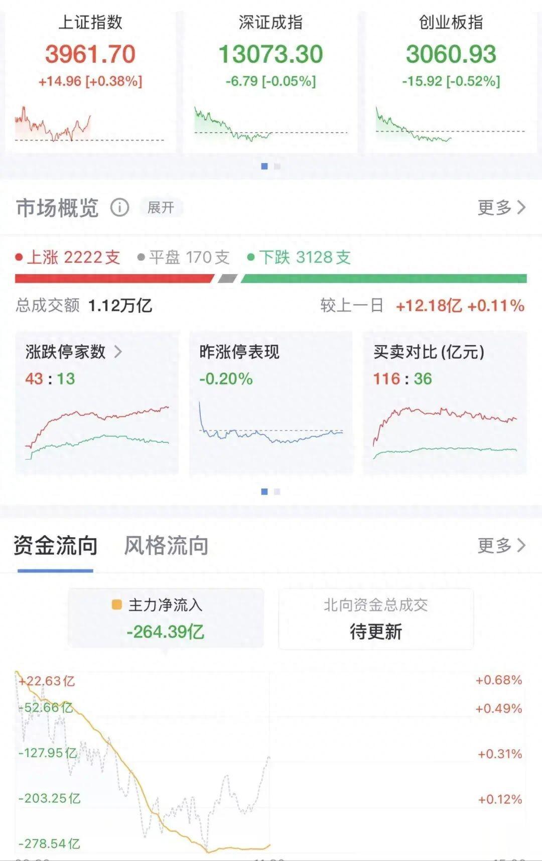 11月20日,市场早盘高开低走,创业板指跌0.52%,此前一度涨超1.5%。截至收盘,沪指涨0.38%,深成指跌0.05%,创业板指跌0.52%。
