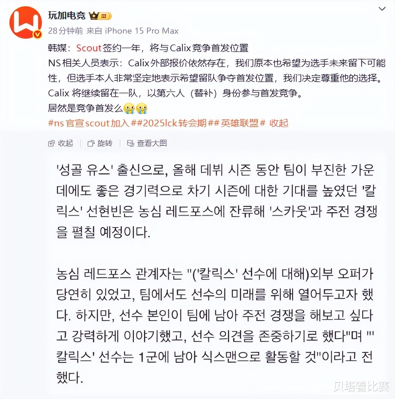 另外韩媒也第一时间爆料:scout和NS只签了1年,并且将和Calix竞争首发中单的位置。韩媒采访了NS的工作人员,工作人员表示Calix是替补的身份,不过还是有和Scout竞争首发的资格。