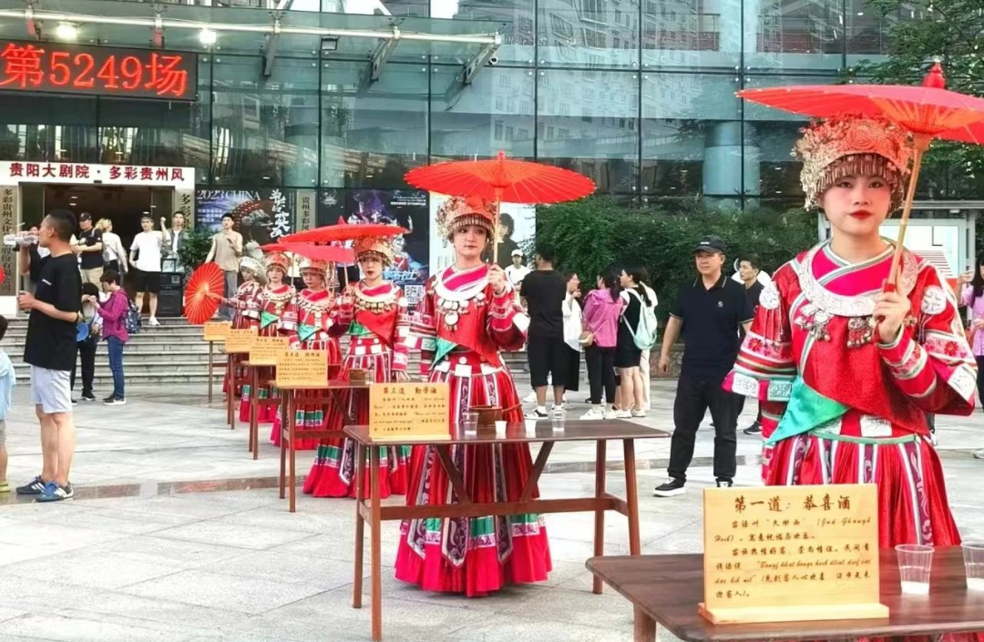 在正式剧目开演前,增加了“拦门酒”互动活动,让观众现场体验极具贵州民族特色的酒礼酒仪,在剧场演出结束后,又为现场观众准备了一场热闹的篝火晚会,让观众在沉浸式的民族歌舞表演中参与民族广场舞、竹竿舞等互动,感受多彩贵州的好客与热情。