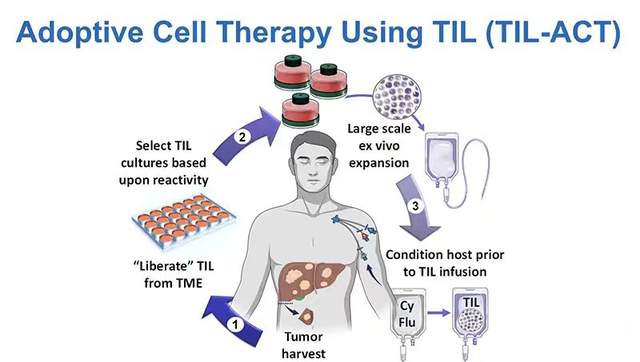 从患者切除的肿瘤中分离出TILs后,在体外使用白细胞介素-2对TILs细胞进行大量扩增,以识别患者癌症的特异性突变。通常需要两到三周时间来培养并评估这些T细胞是否适合后续输注。如果它们符合要求,医生会将实验室培养的T细胞回输到患者的血液中,以摧毁其肿瘤。在输注之前,患者需要接受淋巴细胞清除化疗,再输注肿瘤浸润淋巴细胞,并辅以大剂量白细胞介素-2以增强抗肿瘤反应。一旦输注,新的TILs具有与患者原始免疫细胞相同的肿瘤浸润特性,就会精准识别出癌细胞的特性并对其进行杀伤,最终达到抗肿瘤的目的。
