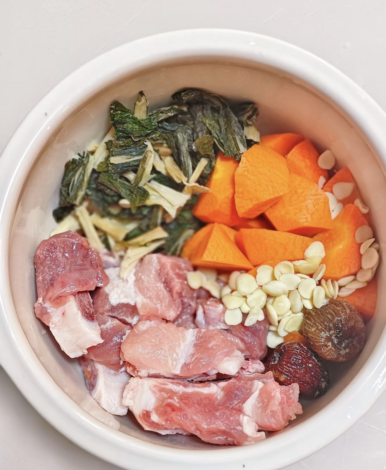先说说这锅汤的灵魂选手。菜干要选那种晒得干巴巴的白菜干,颜色深褐带绿,闻起来有股阳光和泥土混合的清香,这种才是正经八百的好货。猪骨呢,龙骨最佳,带着点骨髓和油脂,炖出来的汤才够醇厚。再配上两根橙红的胡萝卜、一小把南北杏仁,最后扔两颗胖嘟嘟的蜜枣——这阵容,简直就是养生界的"四大天王"啊!