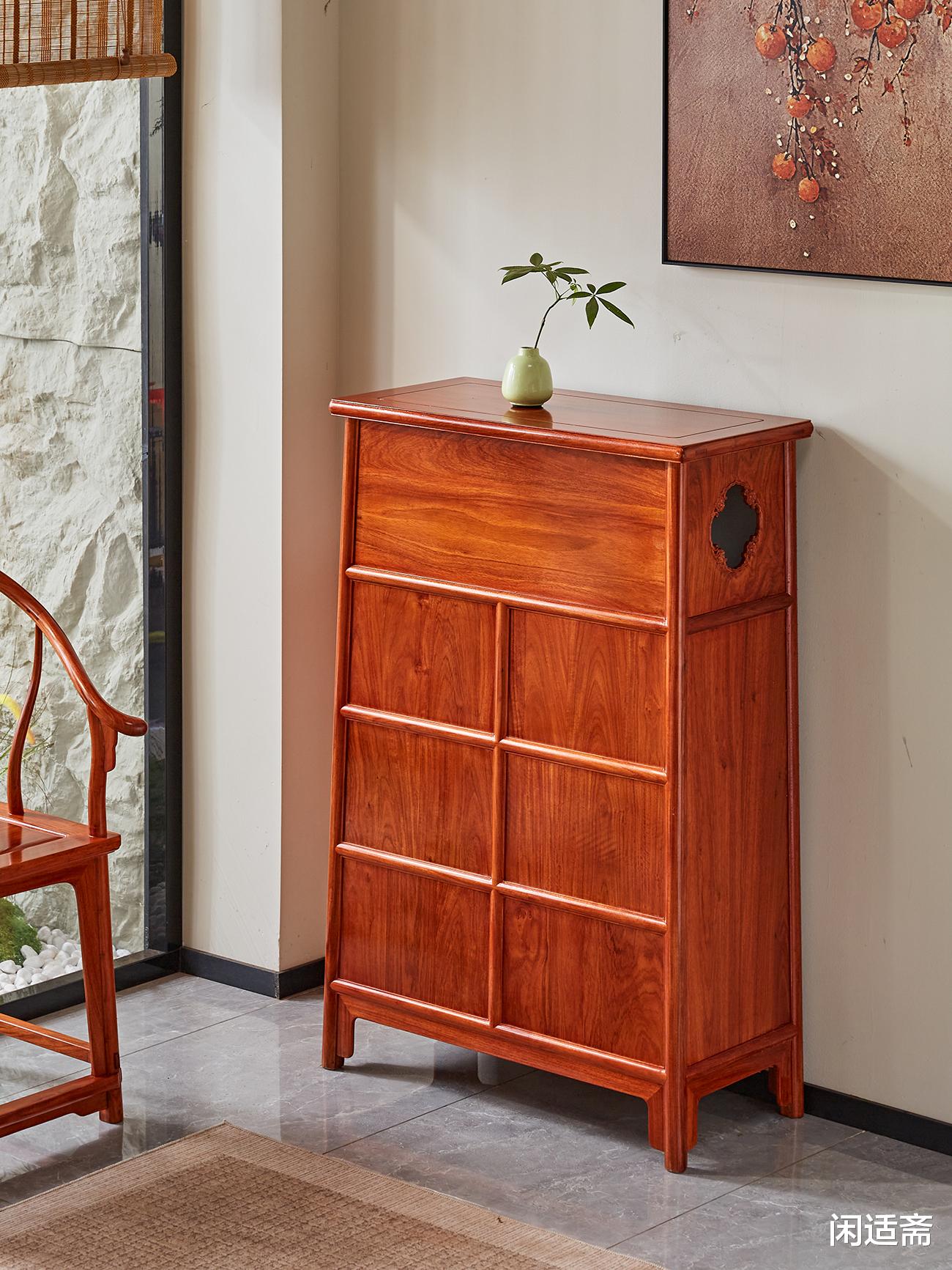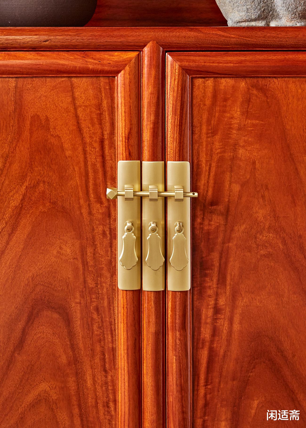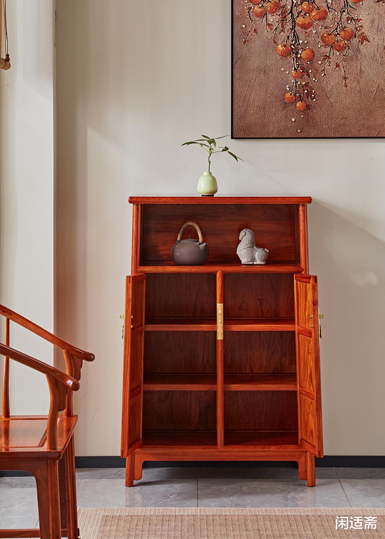此柜通体甄选优质缅甸花梨木打造,木色醇厚雅致,呈黄褐色至红褐色渐变,肌理间可见清晰的水波纹、虎皮纹等天然纹路,独一无二且极具观赏性;木材自带淡淡的檀木清香,轻嗅便能感受雅致韵味,兼具安神静心之效。