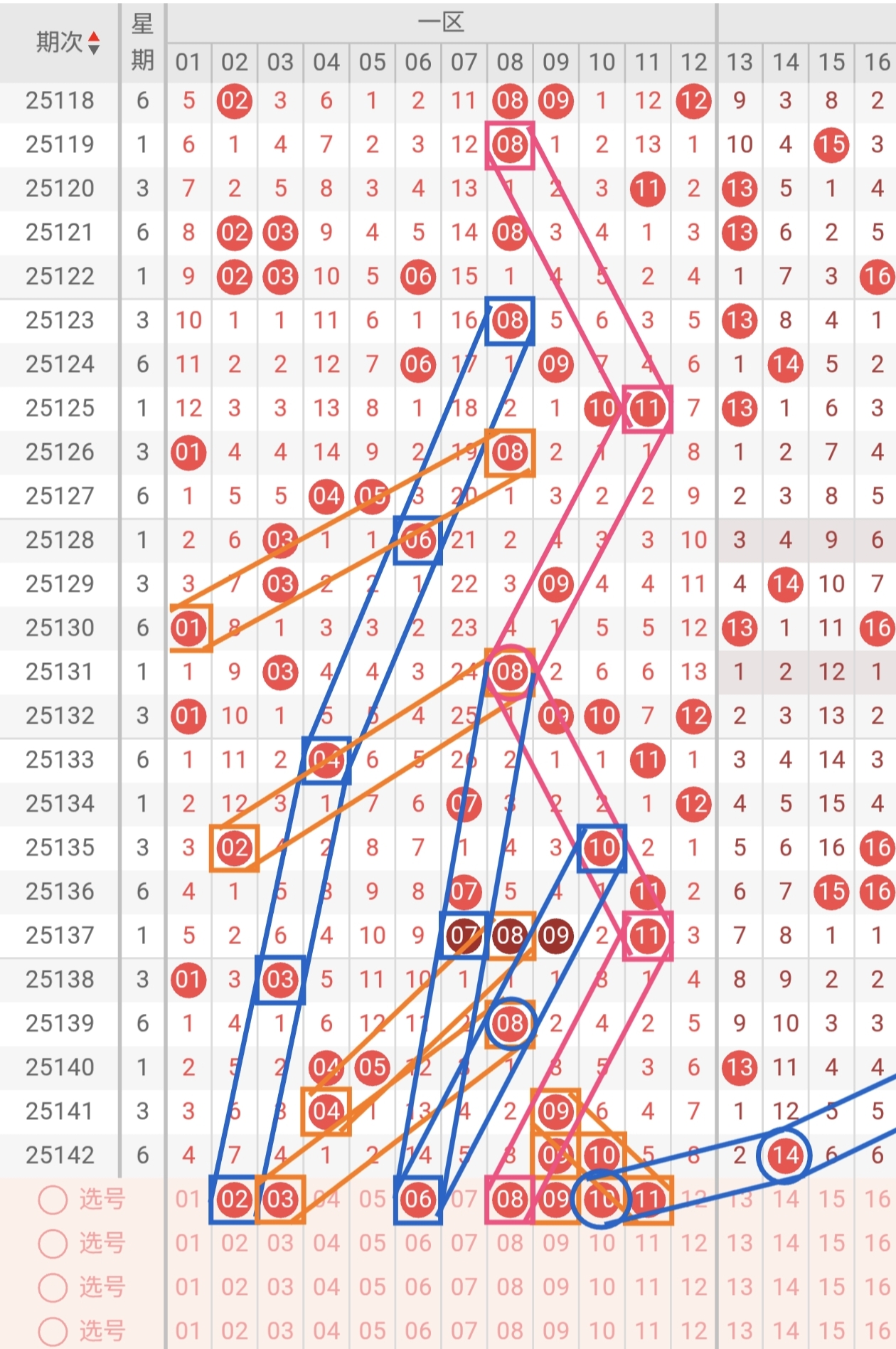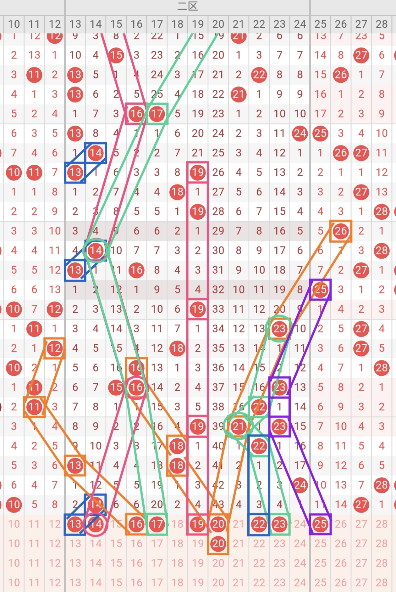 二区推荐13、14、16、17、19、20、22、23等八枚号码,其中重点关注13、14、16、17、19、20等六枚号码;
