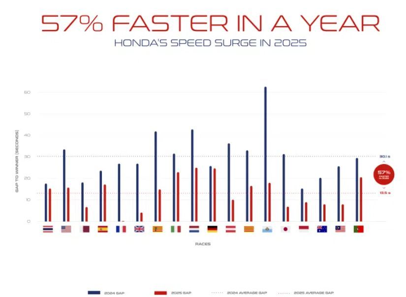 本田的计算数据显示,在2025年MotoGP赛季中,RC213V的速度提升了57%,与2024年赛季相比,与胜利组之间差距缩小了一半以上。