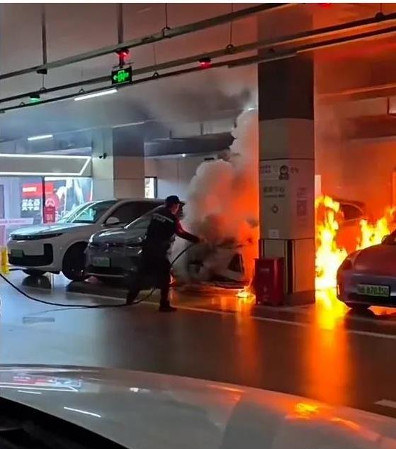 从图片可以看到,着火汽车的两边都是挂的新能源绿牌,说明这两台车也是属于新能源,现在着火了一旦把旁边两辆汽车引着了的话,那事情可就大了。