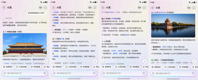 游玩的路上,另一个挑战就是做攻略。故宫那么大,带着娃根本没法随心所欲地乱逛。正发愁怎么走才能高效打卡又不累,我灵机一动,想起来鸿蒙5的小艺。小艺现在已经是鸿蒙系统级智能体了,随着AI能力不断进阶,已升级为能思考的真人感小艺。只需长按导航条唤醒小艺说:“故宫有哪些是必打卡的?” 小艺会立马生成攻略,从推荐路线、必看宫殿,到拍照出片的好位置都安排得明明白白。