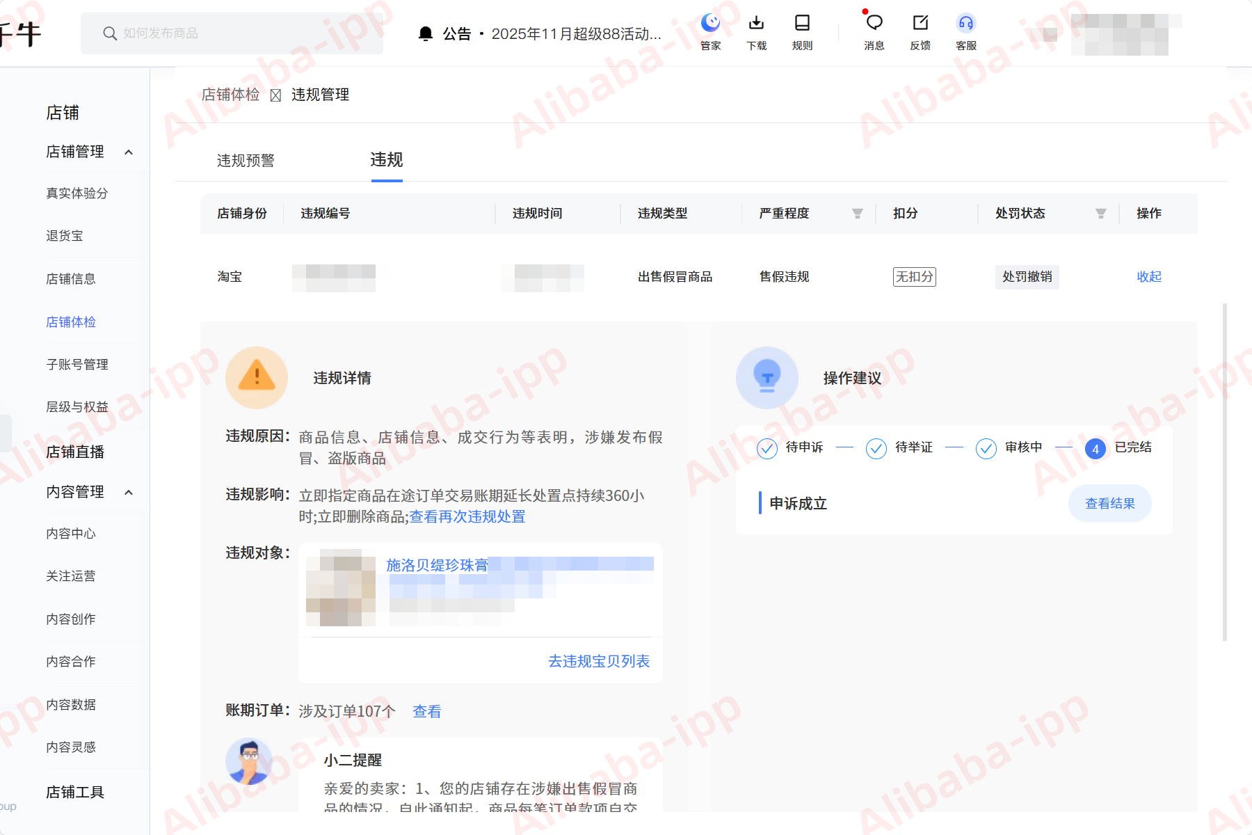 违规原因:商品信息、店铺信息、成交行为等表明,涉嫌发布假冒、盗版商品