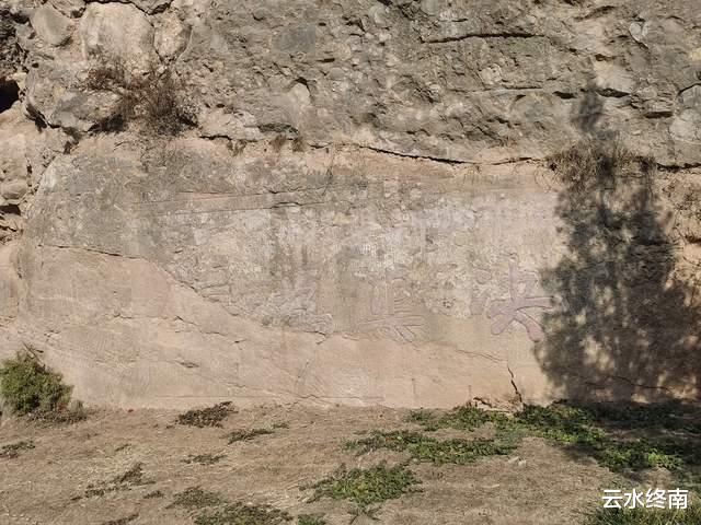 第一个看到的就是“鄂山新渠”。道光二年,鸣玉泉东岸临泾河一侧渠堤被泾河冲毁,鄜州知府凿石洞25米连接上下,这就是鄂州新渠,在石洞上面还刻有“鄂山新渠”“决渠为雨”。