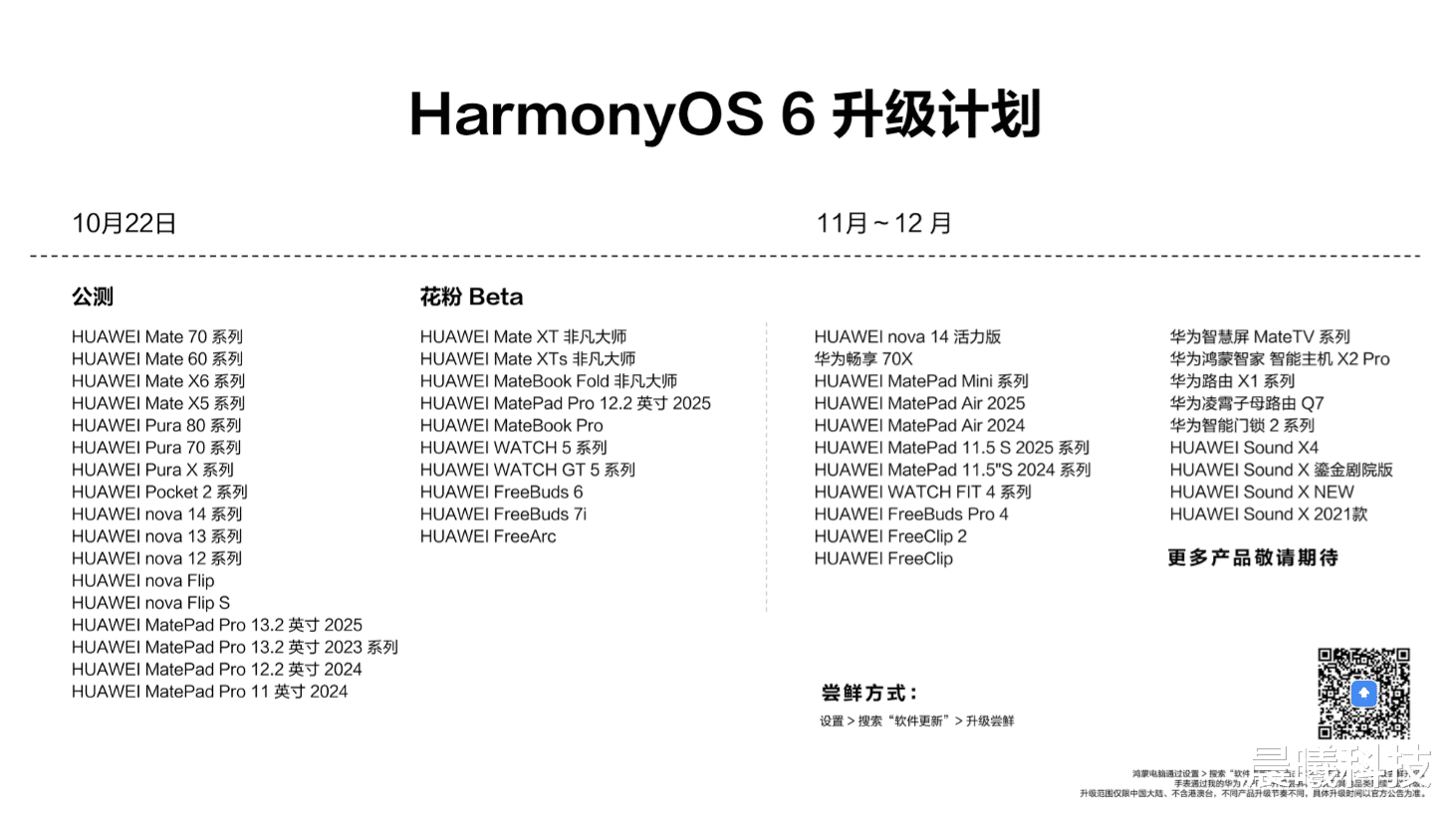 从Mate 70系列到nova Flip,从MatePad Pro到WATCH 5系列——华为公布了详尽的HarmonyOS 6升级计划,涵盖90多款机型,且全部将在年内完成升级。