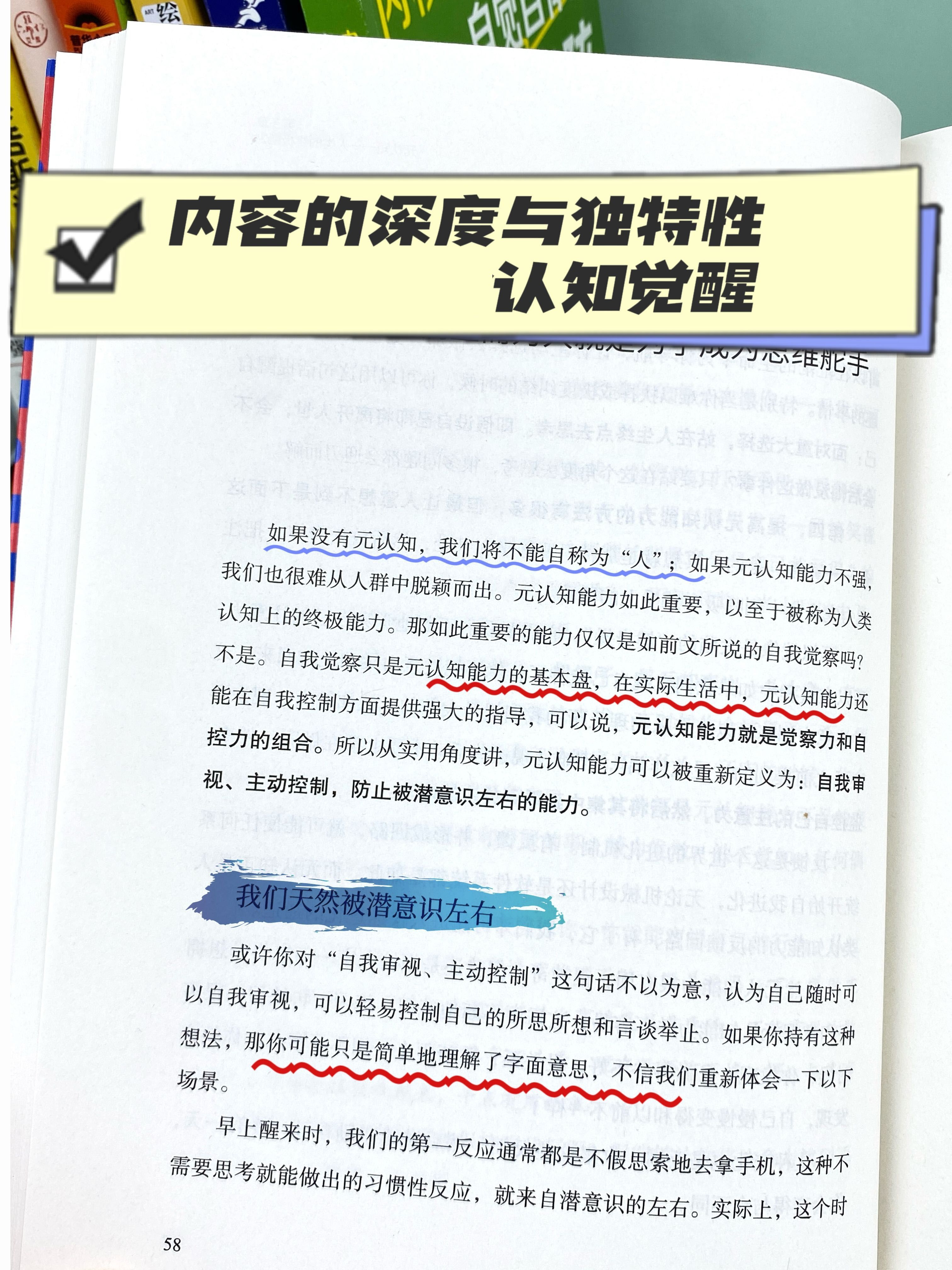 如果没有元认知,我们将不能自称为“人”;如果元认知能力不强,我们也很难从人群中脱额而出。元认知能力如此重要,以至于被称为人类认知上的终极能力。那如此重要的能力仅仅是如前文所说的自我觉察吗?不是。自我觉察只是元认知能力的基本盘,在实际生活中,元认知能力还能在自我控制方面提供强大的指导,可以说,元认知能力就是觉察力和自控力的组合。所以从实用角度讲,元认知能力可以被重新定义为:自我审视、主动控制,防止被潜意识左右的能力。