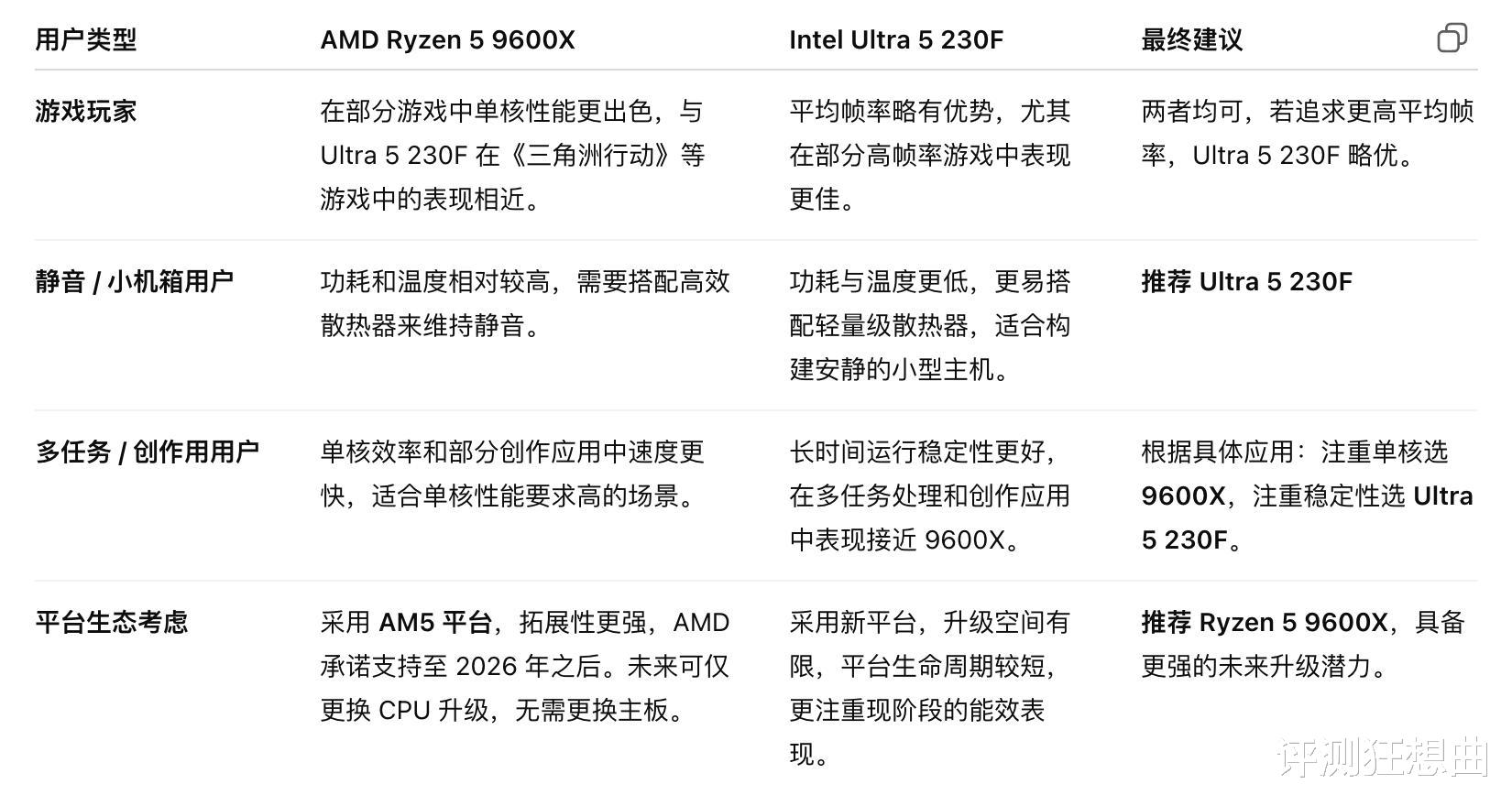 因此,这不是“哪款更好”的问题,而是“哪款更适合你”的问题。若你偏向竞技游戏和低功耗体验,可以考虑Intel Ultra5 230F;若你看重单核性能和AMD平台的未来潜力,AMD Ryzen5 9600X同样值得入手。