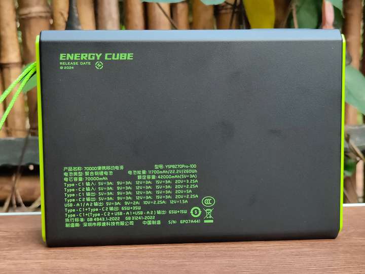 移速能量魔方Pro 的外观设计极具科技感,黑色机身搭配荧光绿配色,居中位置 ”energy cube(能量魔方)“的丝印,具备了超高的辨识度。充电宝整体长度和普通手机差不多,重量大约 1.3kg ,虽说不是那种小巧轻盈的类型,但在70000mAh 的超大容量前提下,完全可以接受。
