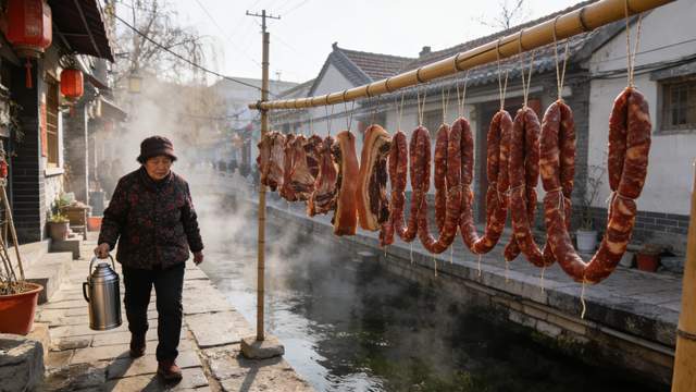 老济南的小寒,是被街巷间的腊香唤醒的。腊月启幕,寻常院落的晾衣绳上,一串串香肠垂挂如红绸,在朔风中静静沉淀,将肉香与香料的醇厚凝于一体。邻里间常相约搭伙灌制,同赴万紫巷遴选鲜醇猪肉、柔韧肠衣,配八角、料酒等佐料,围坐于灌肠器旁分工忙碌,欢声笑语漫过院墙,为漫长冬夜添了几分暖意。若想寻得最地道的本味,可往老城区的熟食铺一探,刚出锅的香肠切片装盘,咸香入肌理,佐一碗绵密热粥,便是清晨最妥帖的慰藉。