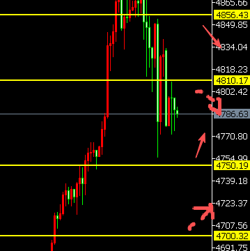 2、处在4810下方,再次回落,下方或再探4750的位置。关注此位置二次支撑反弹,双支撑,上方调整,再战4810的位置。